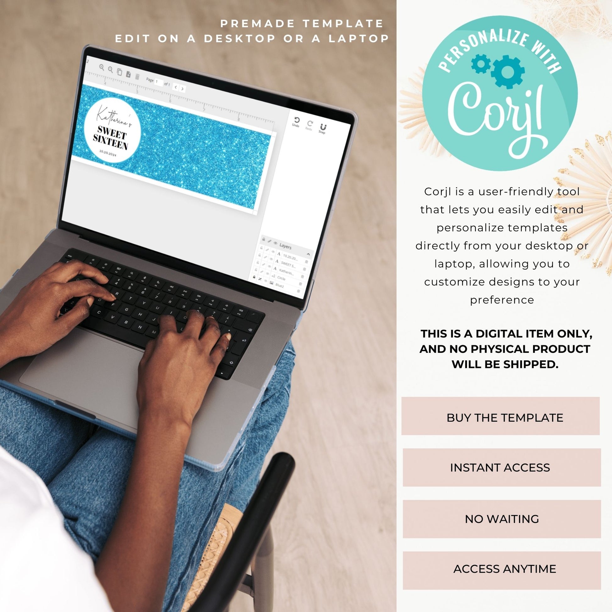 After purchase, you’ll receive two emails: one from Shopify with instructions and one from Corjl with a link to access and edit your template. Simply customize, and you're ready to print!