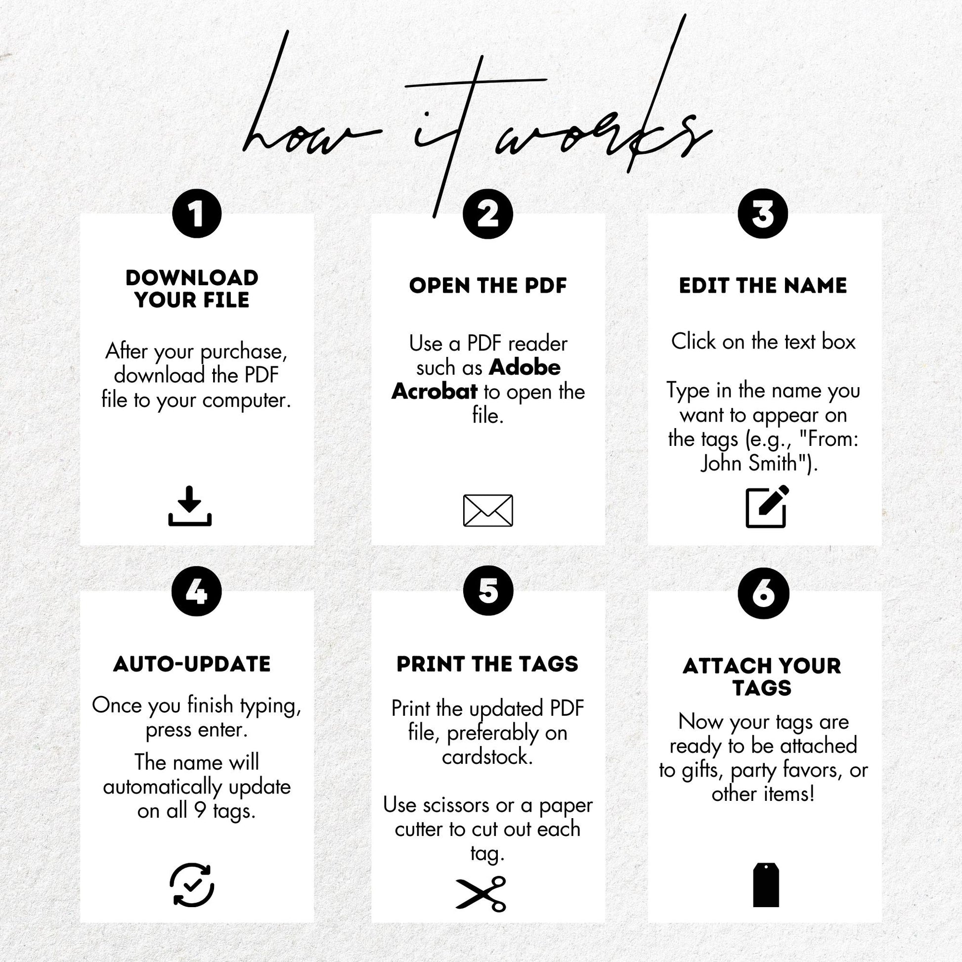 - Once your purchase is complete, you’ll receive an instant download of the PDF file, allowing you to personalize and print your tags immediately.