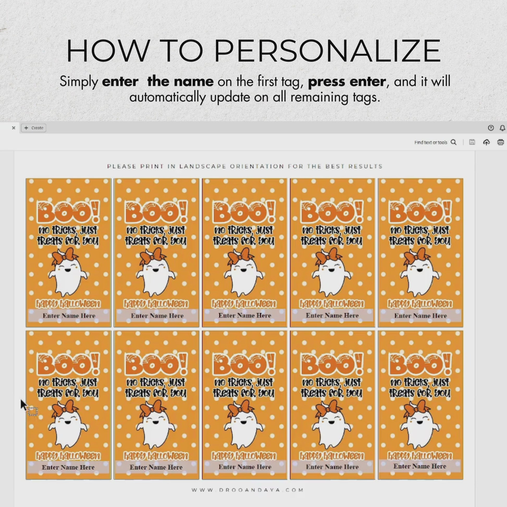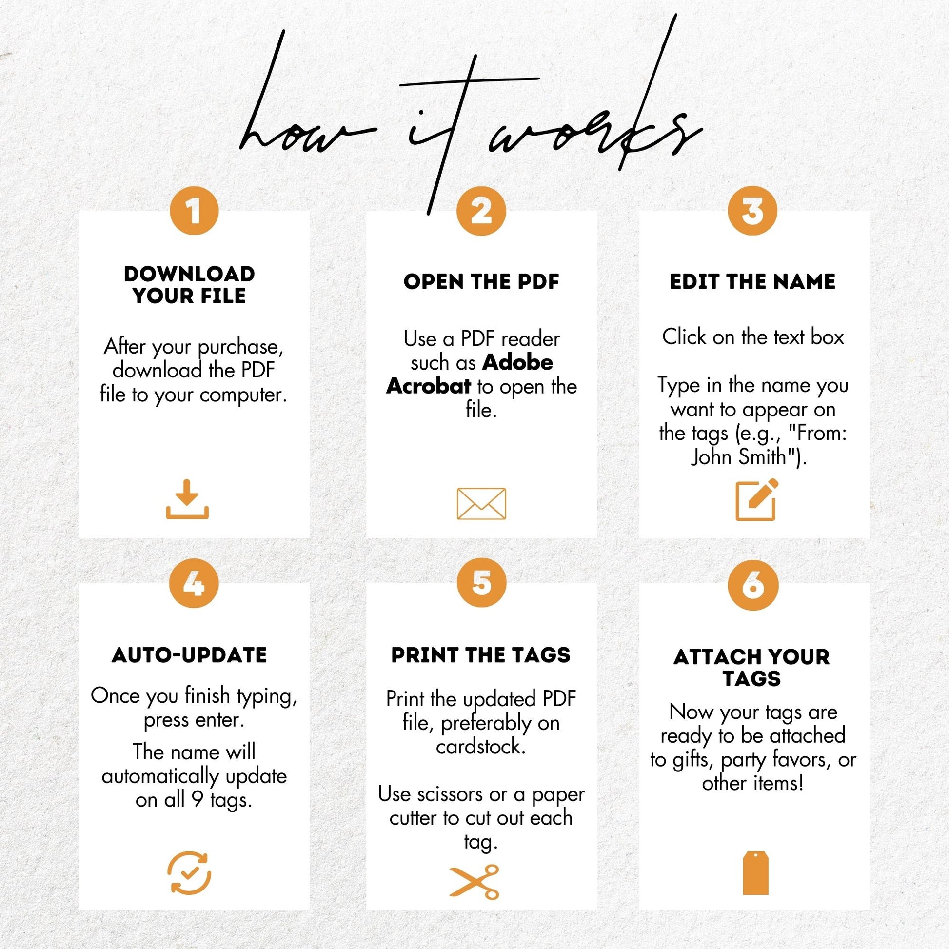 - Once your purchase is complete, you’ll receive an instant download of the PDF file, allowing you to personalize and print your tags immediately.