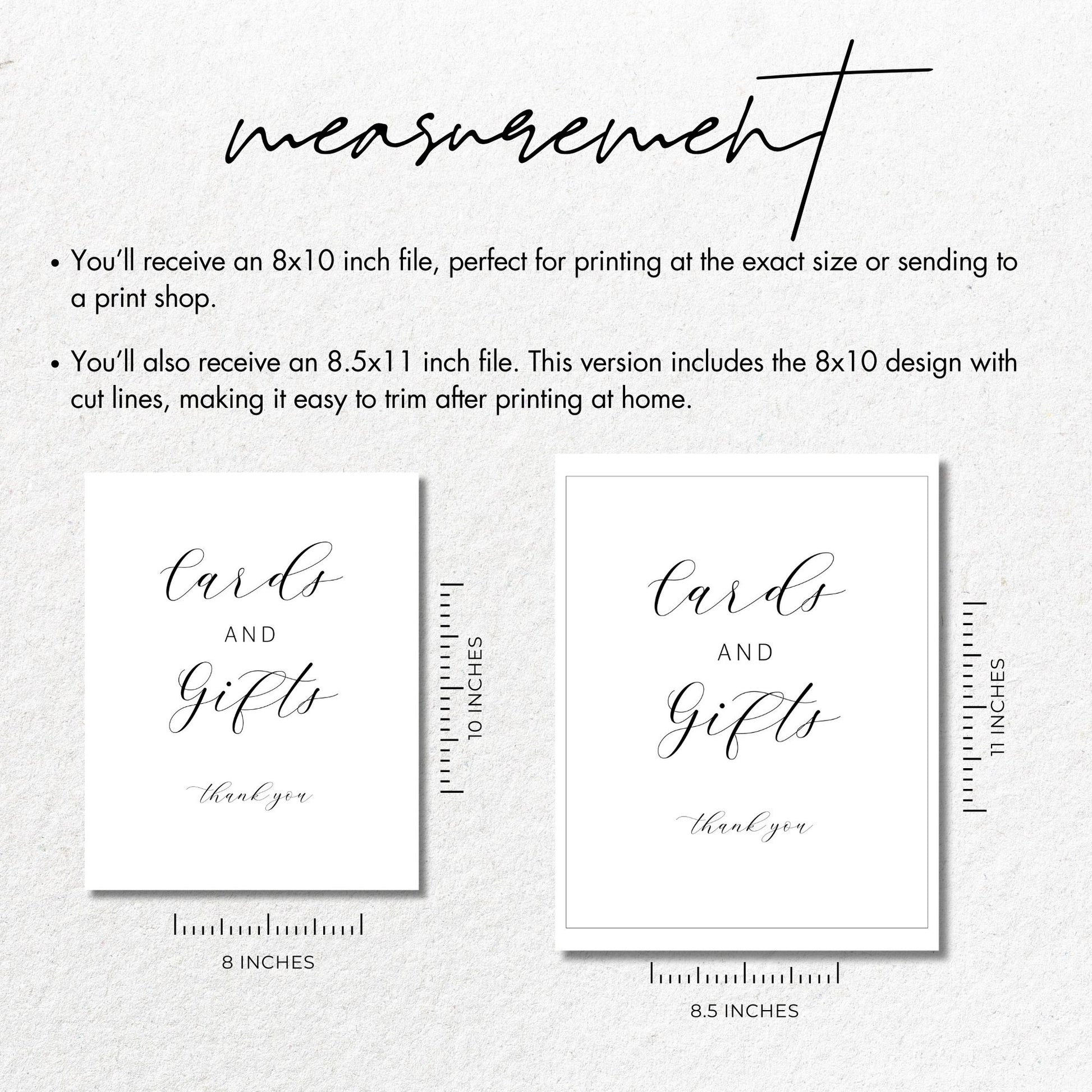 This simple yet sophisticated "Cards and Gifts" sign is perfect for adding a touch of elegance to your event! With its minimalist black and white design, this 8x10 printable is ideal for weddings, bridal showers, baby showers, birthdays, and more. Just download, print, and display on your cards and gifts table to guide guests with style.