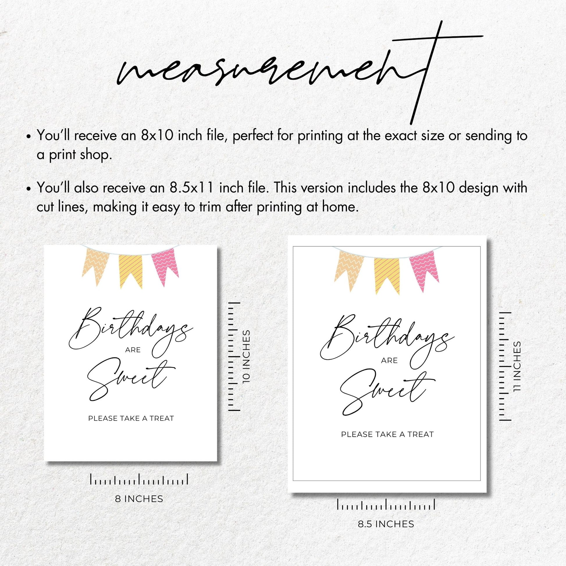 Brighten up your birthday party with this charming "Birthdays Are Sweet, Please Take a Treat" sign π! Featuring a playful, colorful banner design, this 8x10 printable sign is perfect for your dessert or favor table, inviting guests to enjoy a treat. Easy to download and print, itβs a delightful way to add a personal touch to your party decor.