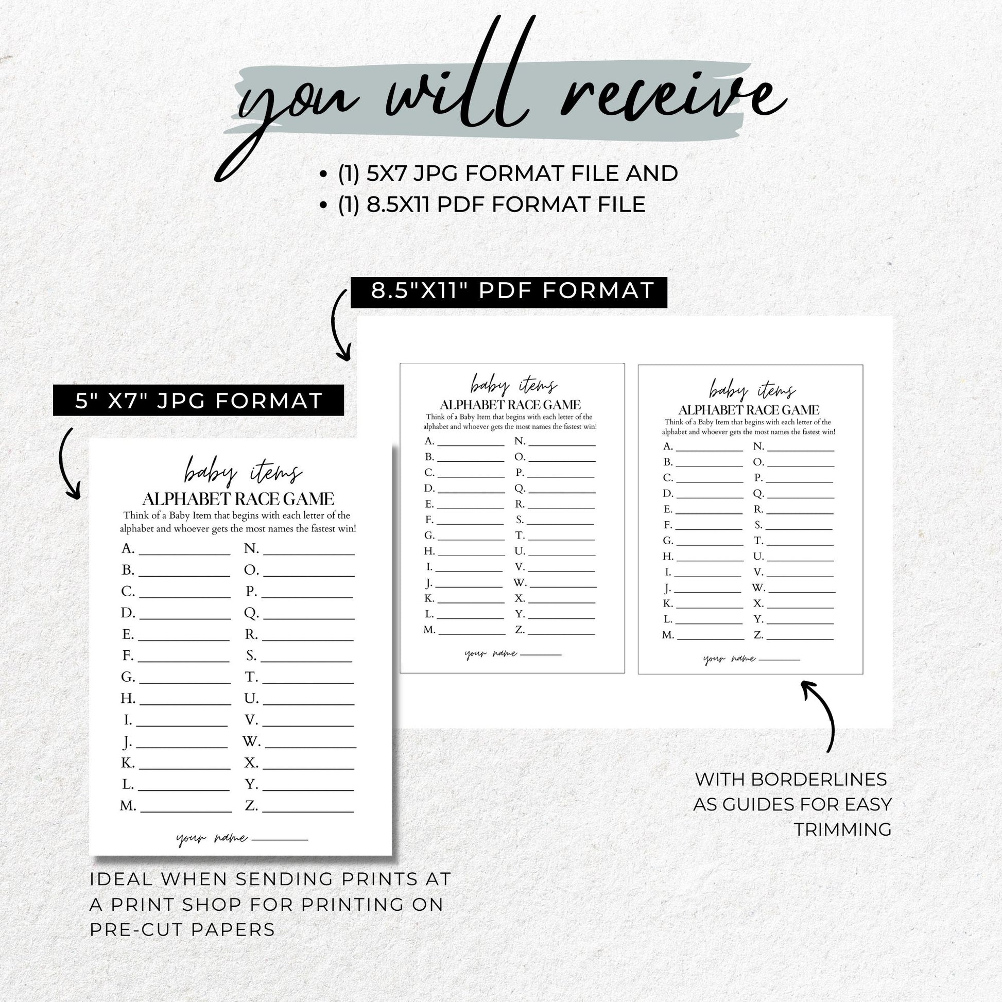 - (1) 8.5" X 11" size PDF file with two game cards on the sheet, ready to print on letter-size paper.