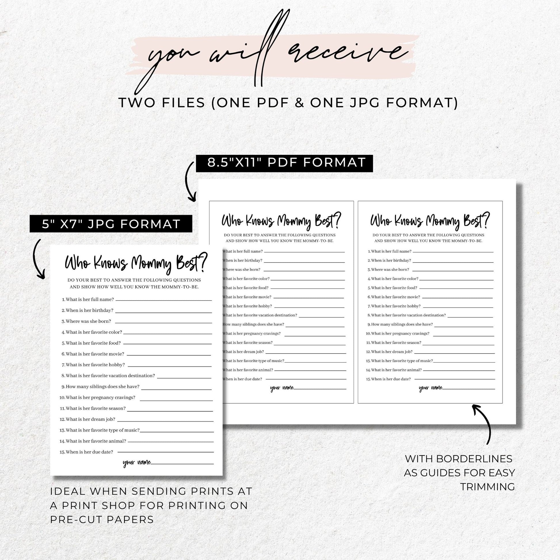 Get ready for a delightful and engaging baby shower activity with our "Who Knows Mommy Best" game. This printable game is perfect for celebrating the mommy-to-be and testing the knowledge of the guests. It's a wonderful way to bring everyone together and see who knows the most about the expectant mom!