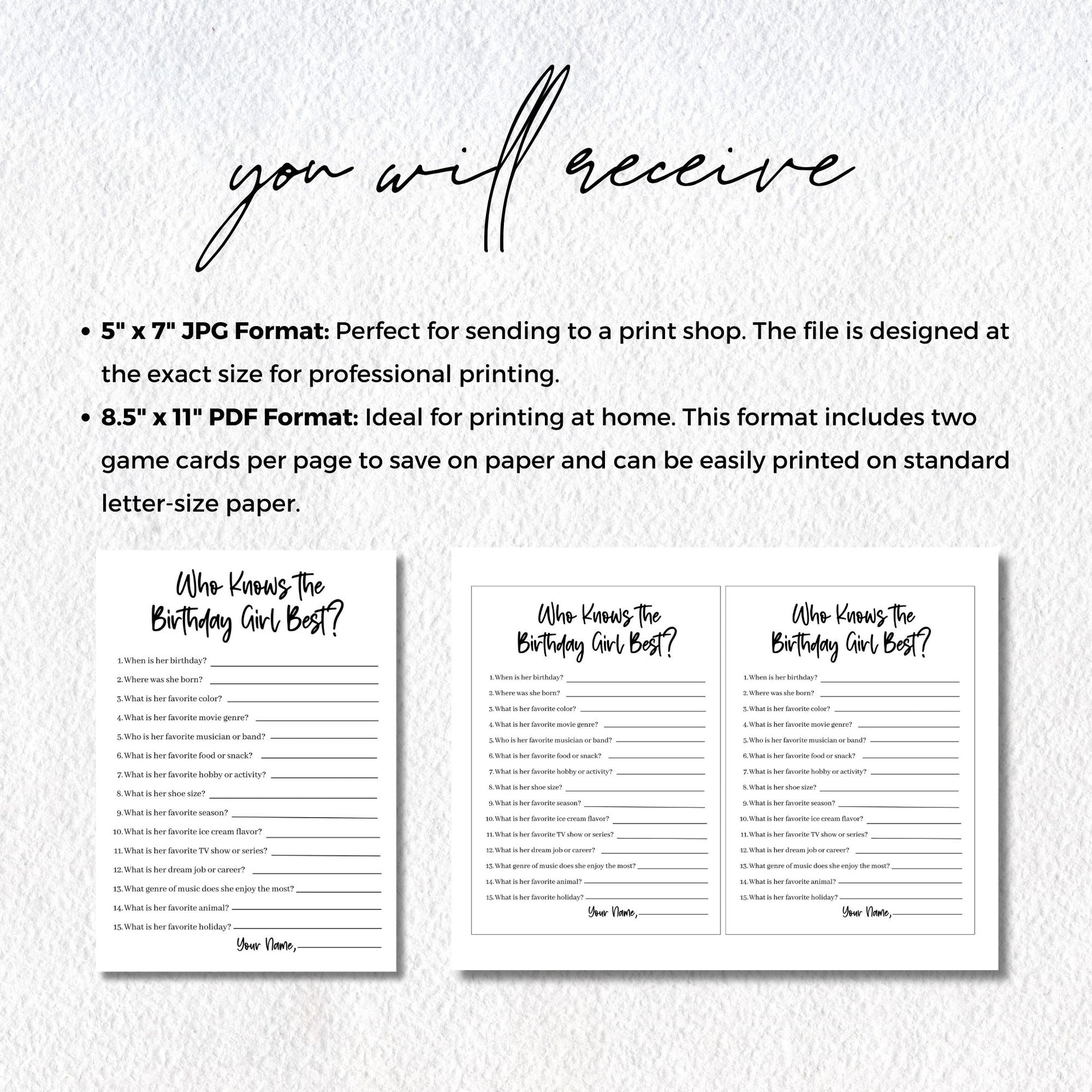 Get ready for a fun and interactive game with "Who Knows the Birthday Girl Best?" 🎉! This printable trivia game challenges guests to see how well they know the birthday girl by answering questions about her favorite things, hobbies, and more. Perfect for birthday parties of all sizes, this game sparks conversation and laughter while adding a personal touch to the celebration. The guest with the most correct answers wins!