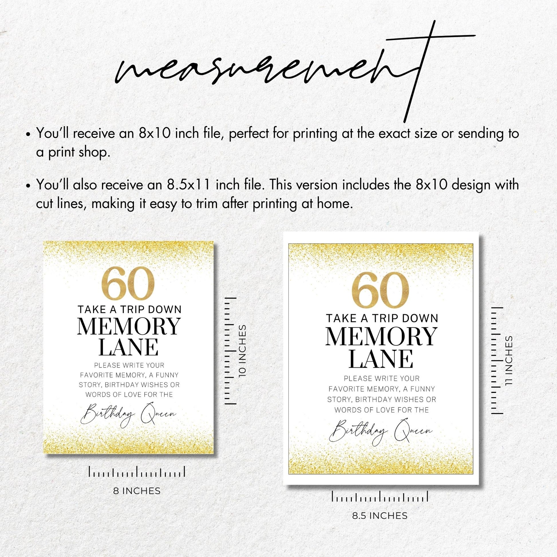 Celebrate a special 60th birthday with this "Take a Trip Down Memory Lane" sign ✨! Featuring a glamorous gold glitter design, this 8x10 printable sign invites guests to write their favorite memory, a funny story, or birthday wishes for the Birthday Queen. Perfect for creating a meaningful keepsake, this sign adds a beautiful and personal touch to any birthday celebration. Simply download, print, and display!