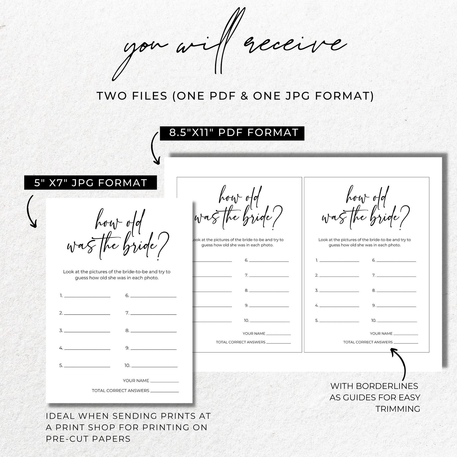This printable bridal shower game is perfect for fun and laughter. Guests guess the age of the bride in each photo - the closest one wins! Get your guests engaged, with memories to last a lifetime.