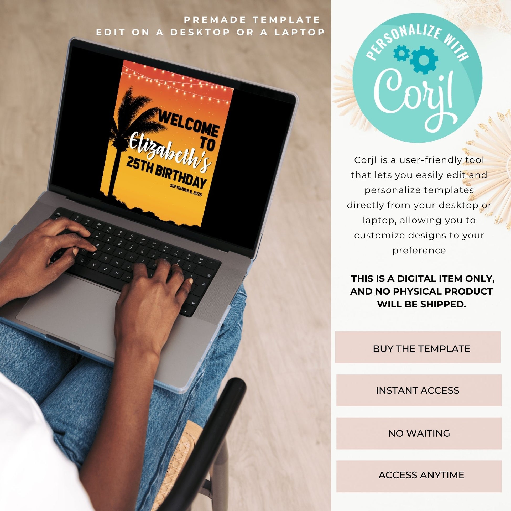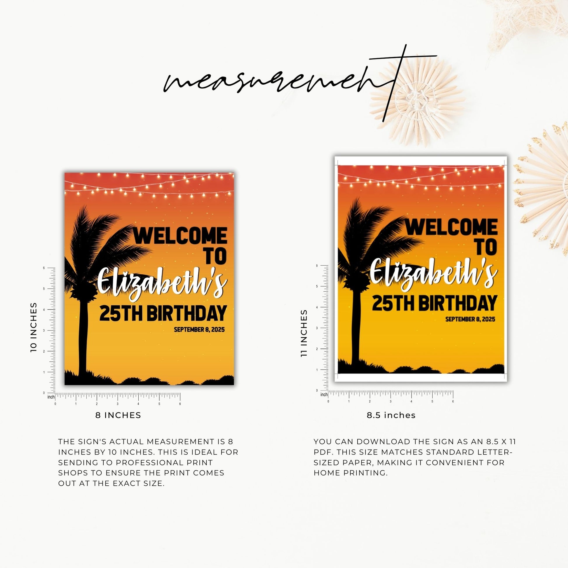 Welcome your guests in style with this stunning tropical sunset-themed birthday sign ๐ ๐ด! Perfect for any birthday celebration, this 8x10 editable template allows you to personalize the birthday name, age, and date directly in Corjl. Featuring a palm tree silhouette against a glowing sunset with string lights, this design is perfect for summer, beach, or tropical-themed parties. Simply edit, download, and print for a unique and personalized party touch!
