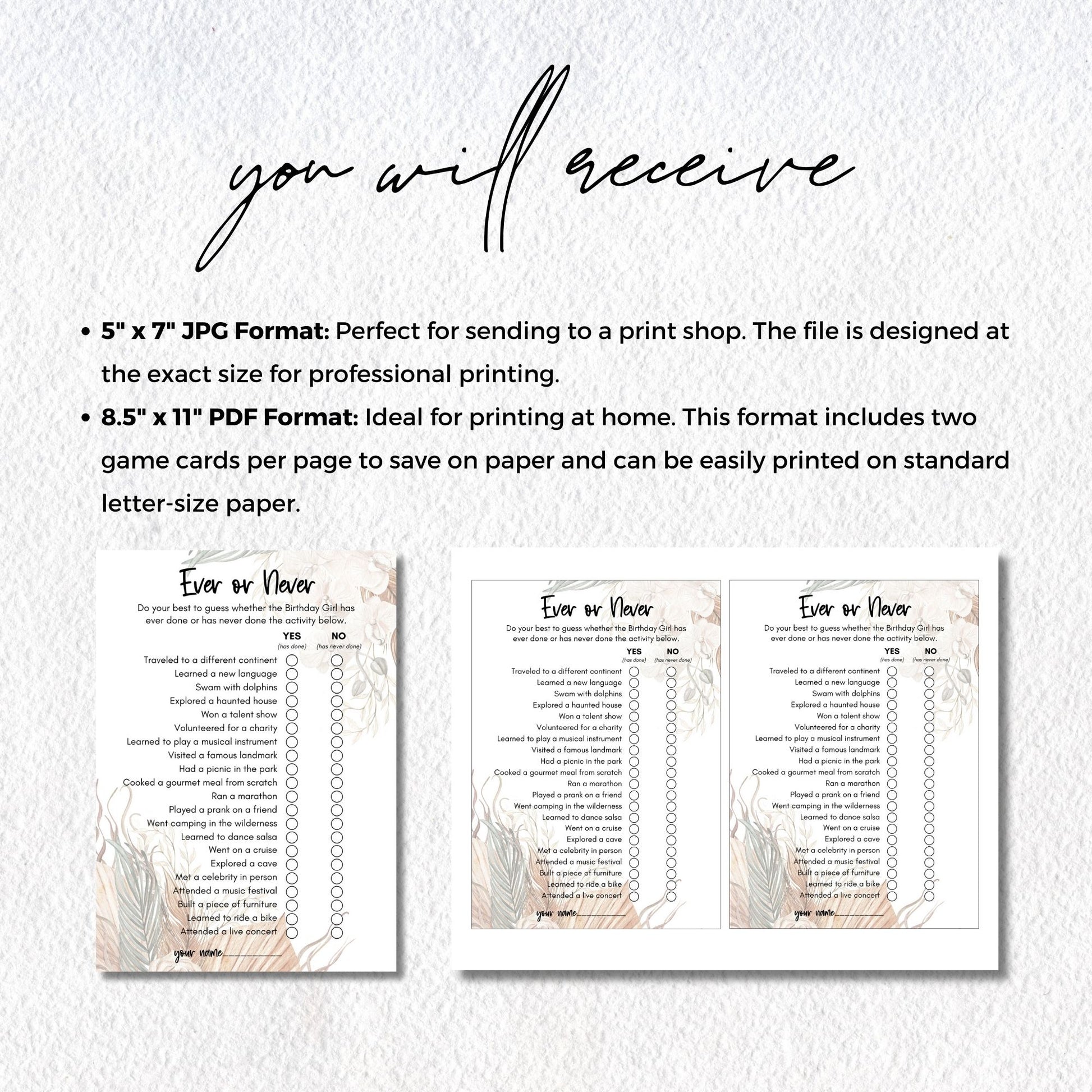 Ever or Never Birthday Game, Fun Printable Activity for Birthday Parties