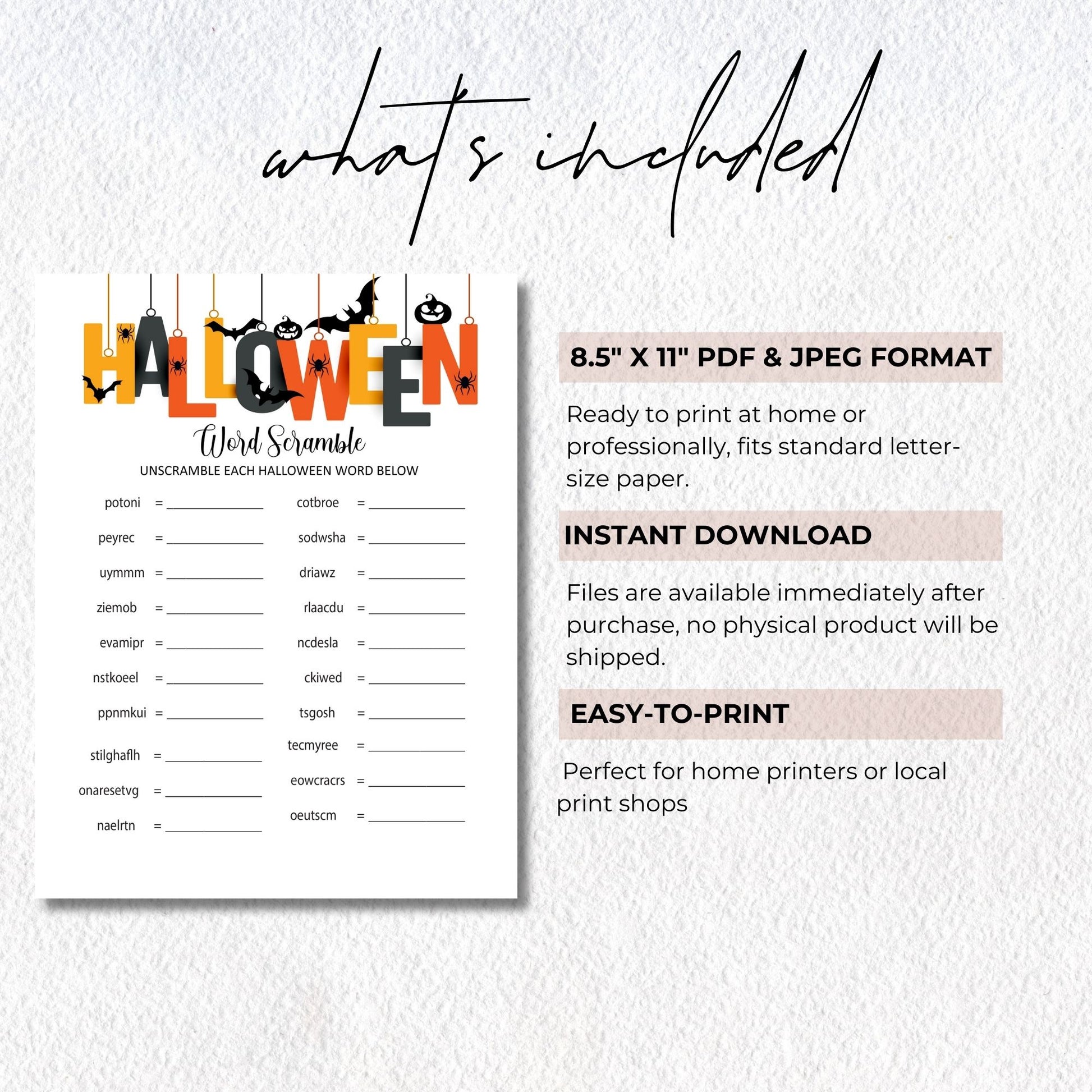 Get ready for some spooky fun with this Halloween-themed Word Scramble! Perfect for parties, family gatherings, classrooms, or just a fun way to celebrate the Halloween season. Challenge your guests to unscramble popular Halloween words and see who can solve them all first! Download, print, and play instantly for a hassle-free Halloween activity!