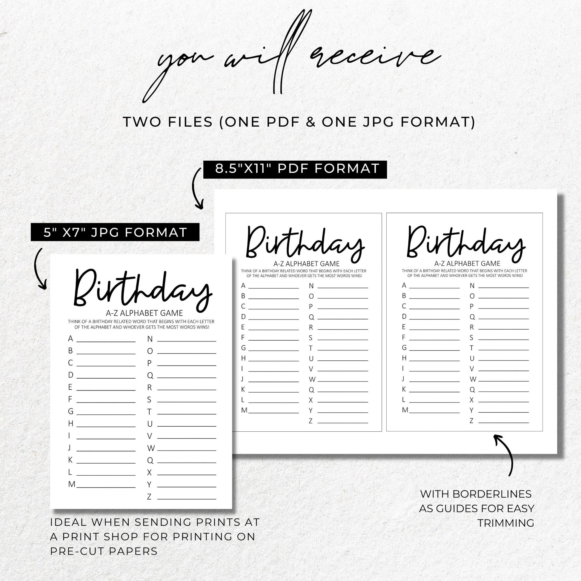 Discover the hassle-free way to create a unique and memorable birthday party with our Printable Birthday Alphabet Party Games. Get your A-Z alphabet game instantly with our easy-to-download product, perfect for any age group. Make the most out of your special day with our hassle-free party games!