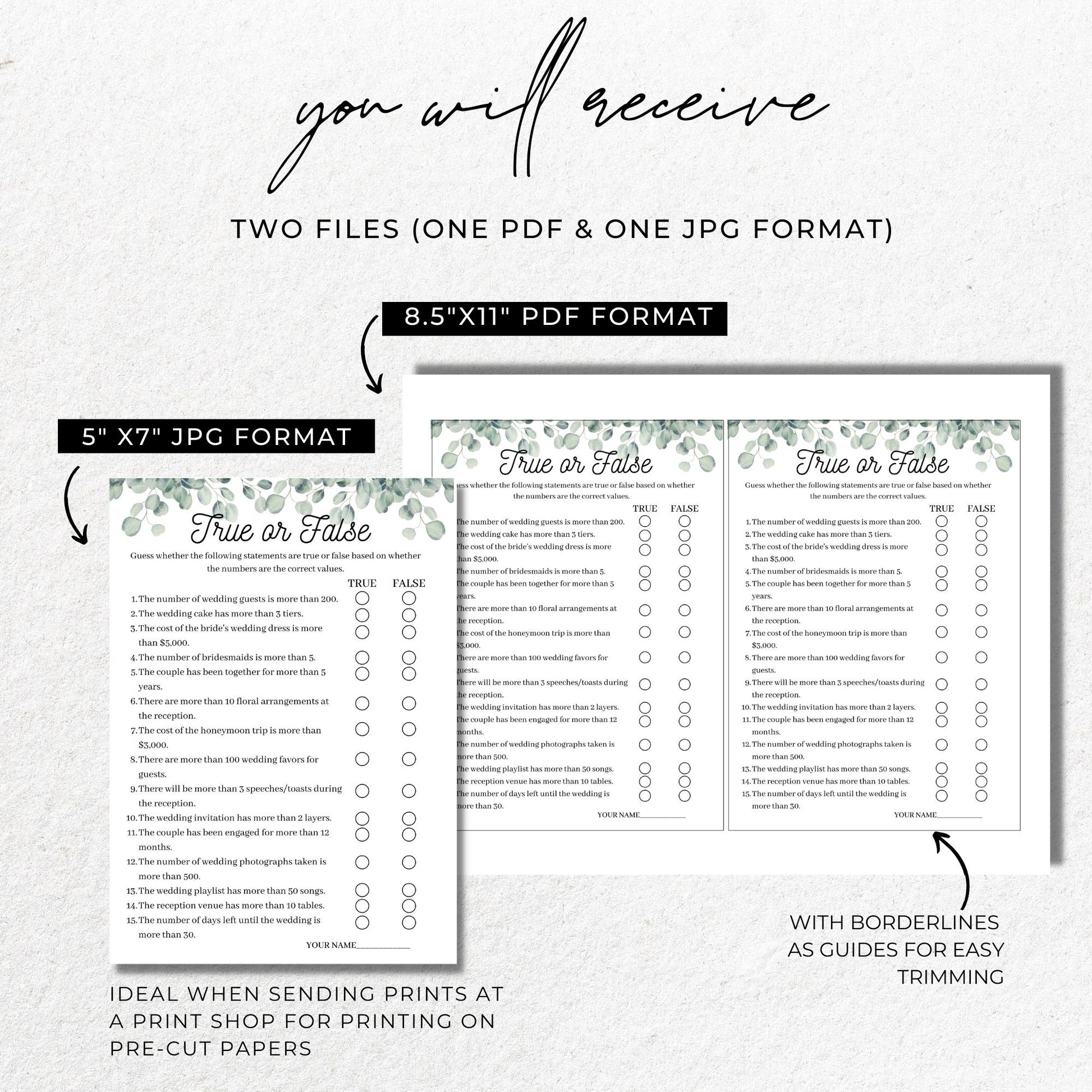 This True or False Bridal Shower Game is perfect for your special day. Featuring simple and fun questions about the wedding day, this game is sure to keep your guests entertained. With its simple greenery design, it's a great addition to any bridal shower.
