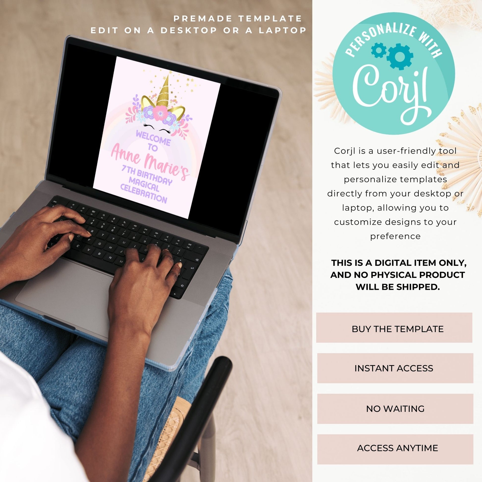 Welcome your guests to a magical celebration with this adorable unicorn-themed birthday sign 🦄✨! Perfect for any age, this 8x10 editable Corjl template lets you customize the birthday name, age, and message directly in your browser. Featuring a whimsical unicorn design with floral details and a rainbow backdrop, it's the perfect decor for a unicorn or fantasy-themed party. Just edit, download, and print to add a personal touch to your special day!