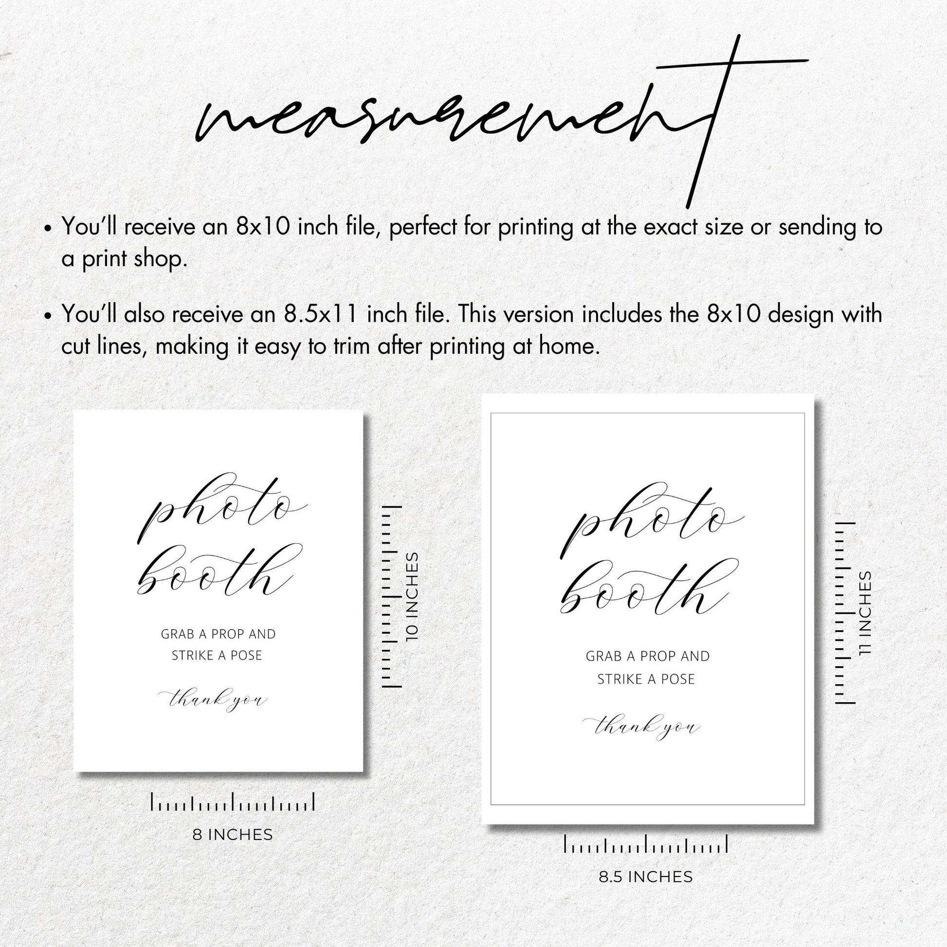 Set the stage for fun and laughter with this stylish "Photo Booth" sign, inviting your guests to grab a prop and strike a pose! Perfect for weddings, birthdays, or any celebration, this printable 8x10 sign adds a touch of elegance to your photo booth setup while encouraging everyone to join in on the fun. Simply download, print, and display for an unforgettable event!