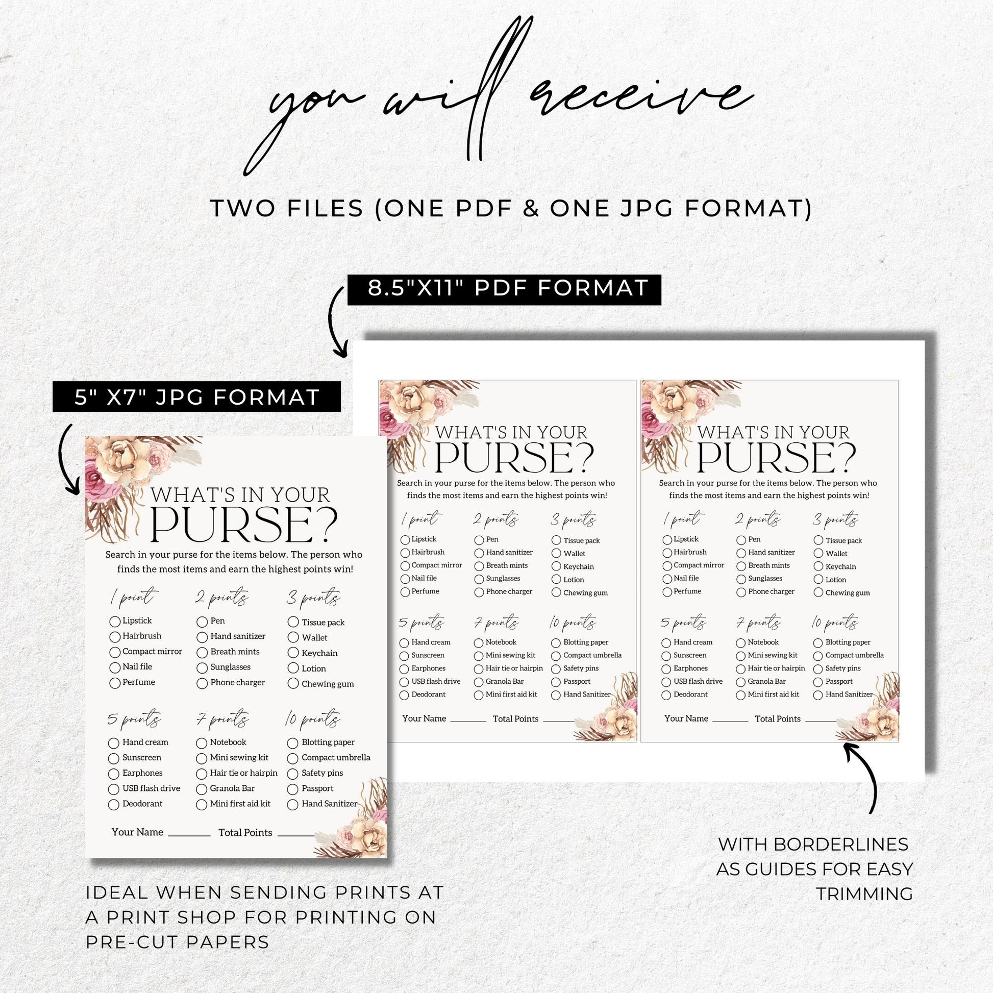 This What's In Your Purse Bridal Shower game comes with a stylish Boho Floral themed printable. Perfect for a fun activity at any bridal shower, this game is sure to bring a smile to all your guests.