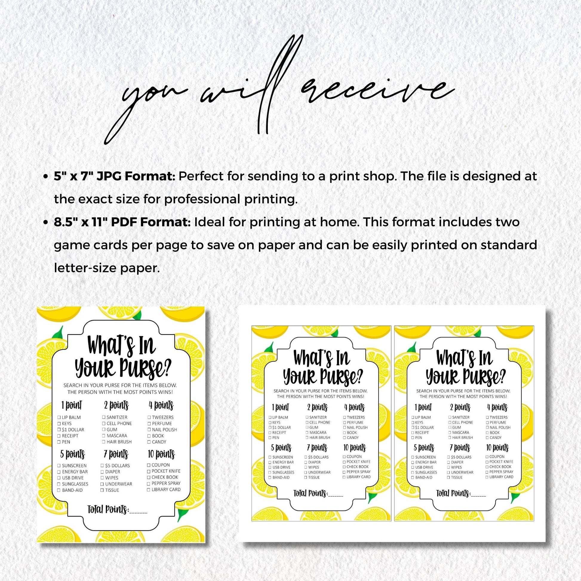 Make your bridal shower extra sweet with this "What's in Your Purse?" game, featuring a fun and refreshing lemon-themed "Main Squeeze" design! 🍋 Guests will search through their purses to find everyday and surprising items, scoring points as they go. The guest with the most points wins, making this game a lively and entertaining addition to your bridal shower. Perfect for breaking the ice and getting everyone involved!
