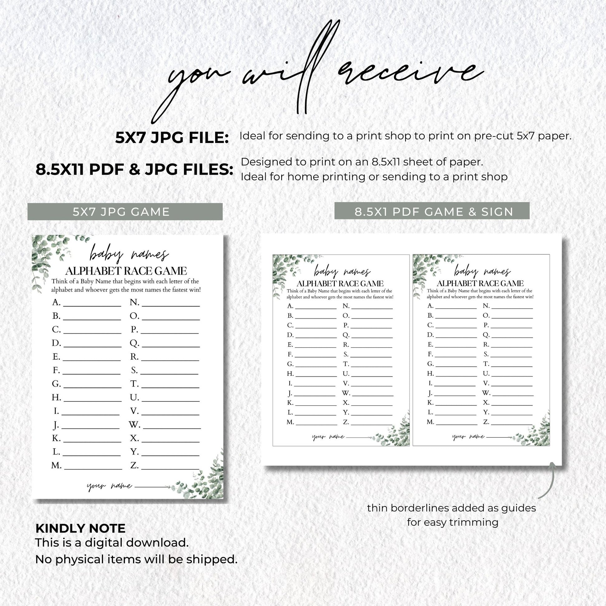 Looking for a fun and engaging activity for your baby shower? Our Baby Names Alphabet Race Game is the perfect choice! This game is designed to bring out everyone’s creativity and competitive spirit as guests race to think of baby names for each letter of the alphabet. Whether you’re hosting an in-person gathering or a virtual shower, this printable game will be a big hit!
