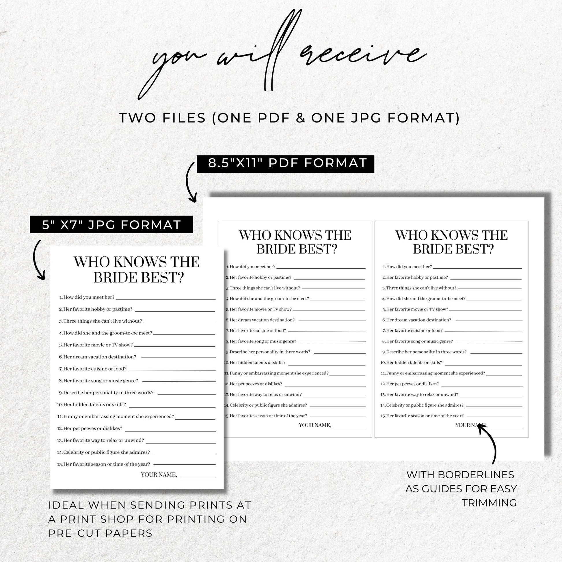 This bridal shower game is the perfect way to start a celebration. Guests compete to see who knows the Bride best while having fun and creating lasting memories. Includes 15 questions designed to bring out the Bride's fun and unique side.