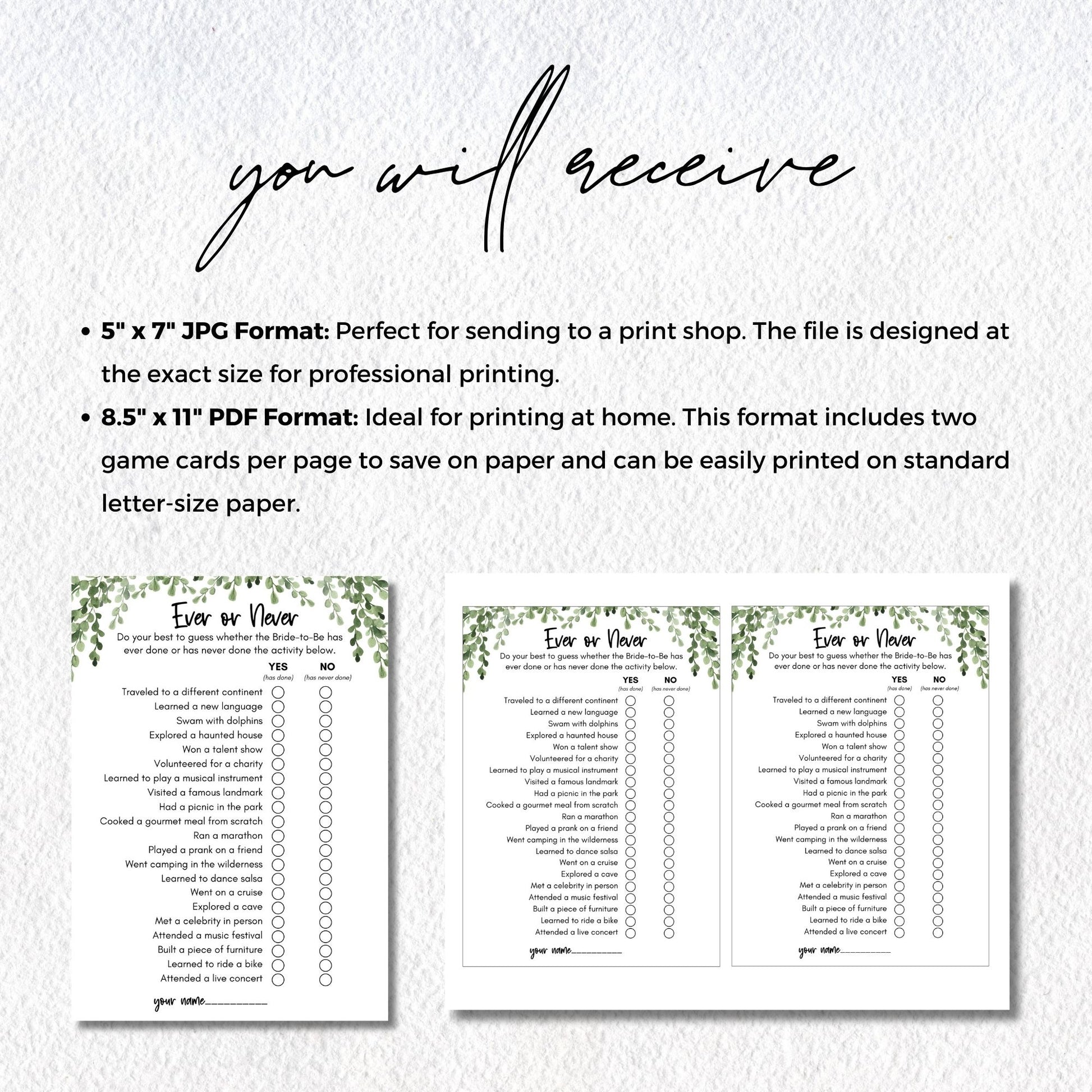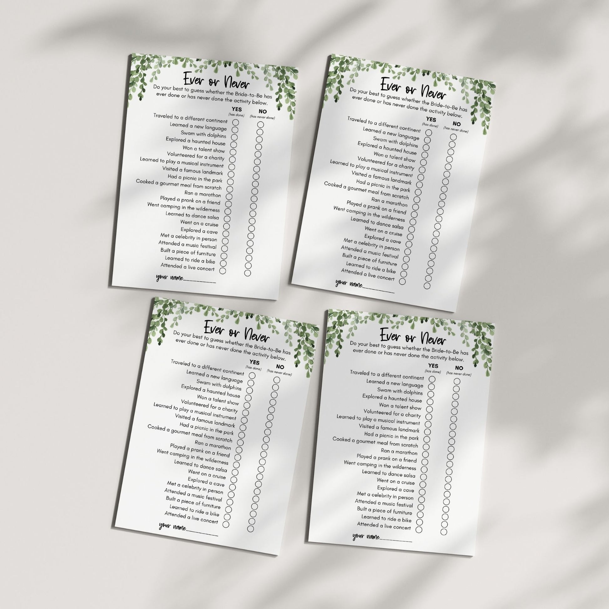 Add some fun and laughter to your bridal shower or bachelorette party with this "Ever or Never" game! 🌿 Guests will try to guess whether the bride-to-be has ever done or never done these exciting activities. This game is a perfect icebreaker, sparking conversations and stories as everyone shares their guesses and finds out more about the bride's adventures.