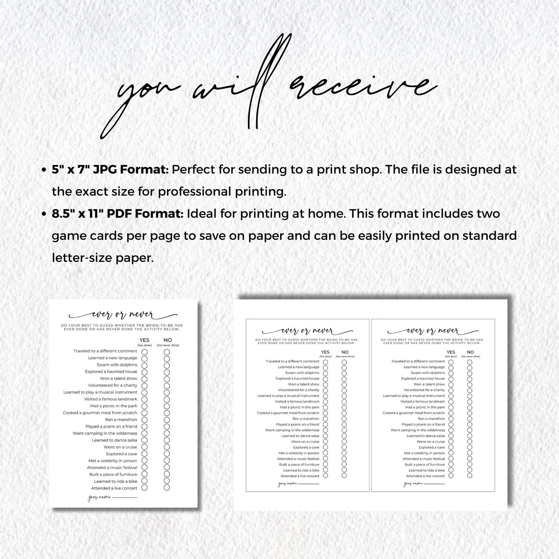 Get ready for some laughs with the "Ever or Never" bridal shower game 🎉! This fun and interactive game asks guests to guess whether the bride-to-be has done a variety of activities. With a modern script design, this printable game is perfect for bridal showers or bachelorette parties, helping to spark fun conversations and keeping everyone entertained.