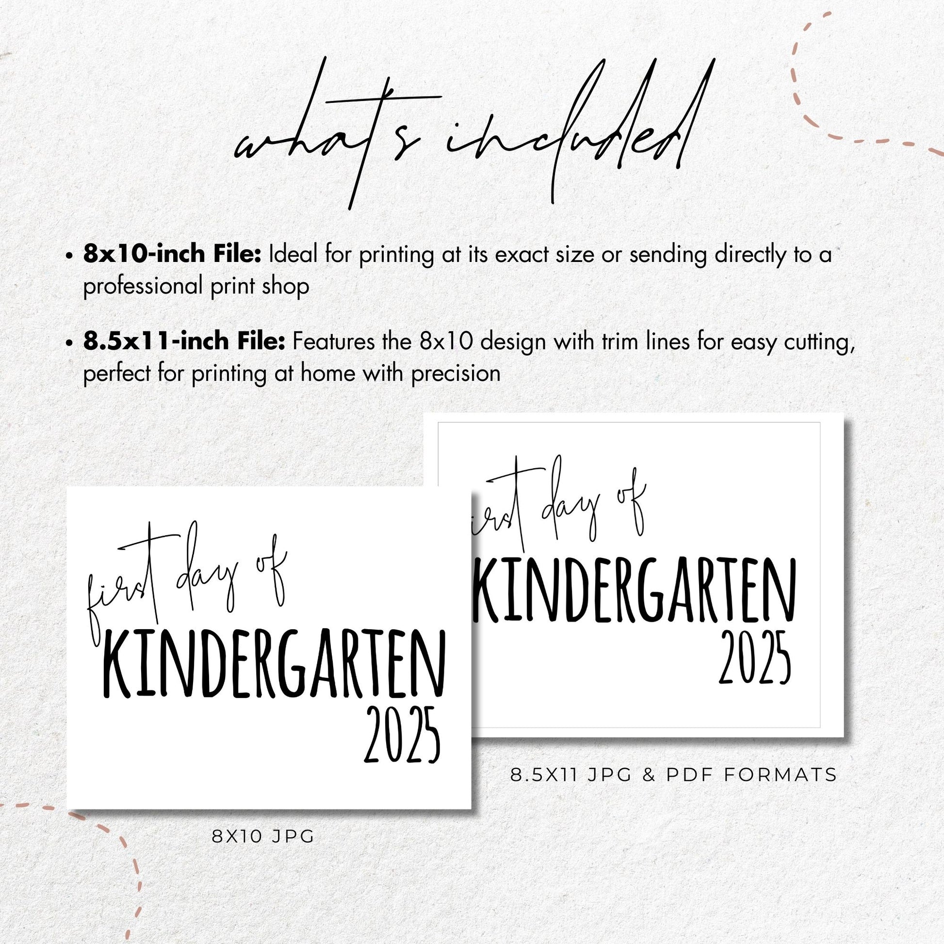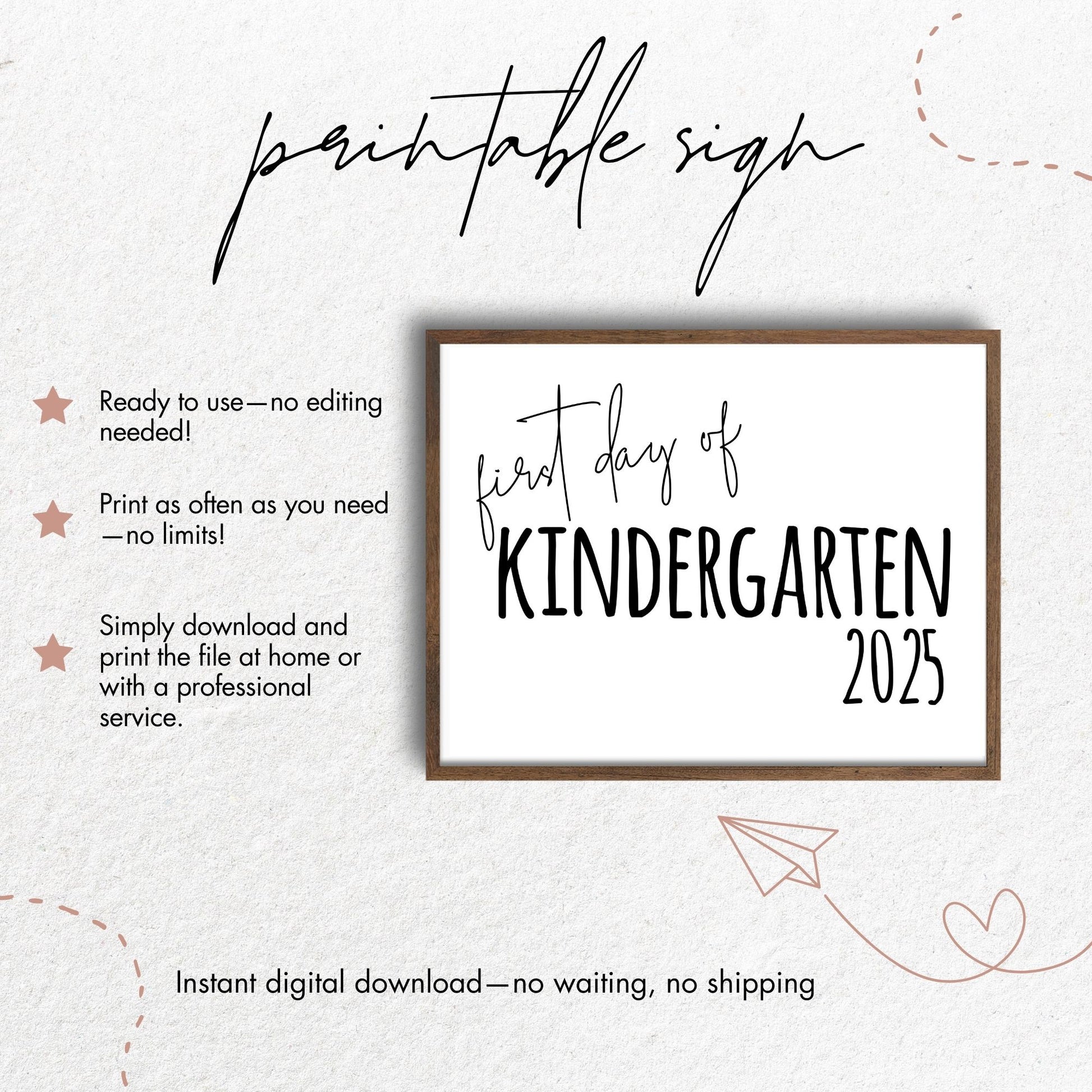 Celebrate the first day of kindergarten with this minimalist 8x10 printable sign! Perfect for back-to-school photos or classroom decor, this black-and-white design marks the start of kindergarten in 2025 and helps capture this exciting milestone.