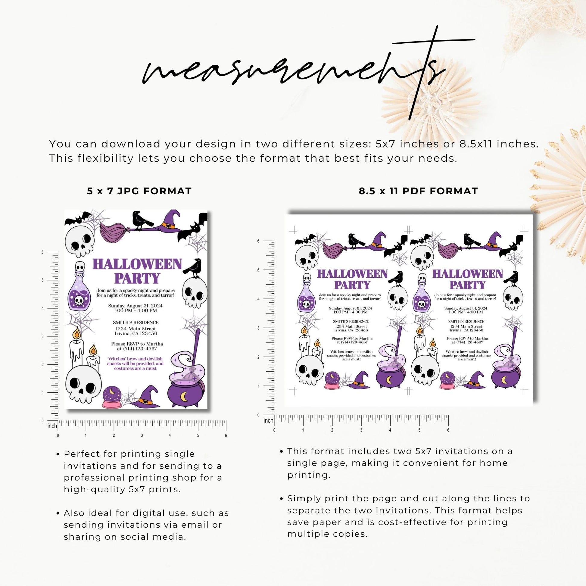 Get ready for a spooktacular night of tricks, treats, and fun with this witch-themed Halloween Party invitation! 🎃🕸️ This editable 5x7 template allows you to customize all event details, including date, time, location, and RSVP information. Whether you're hosting a haunted house bash or a spooky gathering with friends, this invitation sets the perfect eerie tone for your celebration. Edit easily in Corjl, download, and print at home or your favorite print shop
