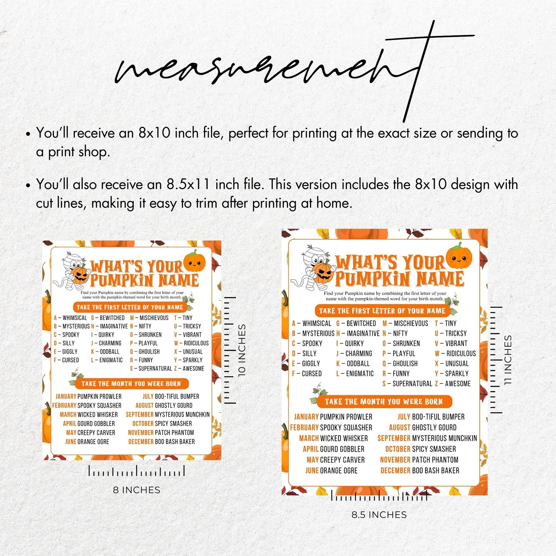 Add some fall fun to your next gathering with this "What's Your Pumpkin Name?" game! 🎃 This digital download is perfect for Halloween parties, fall festivals, or classrooms. Instantly download, print, and discover your silly pumpkin name based on the first letter of your name and birth month!