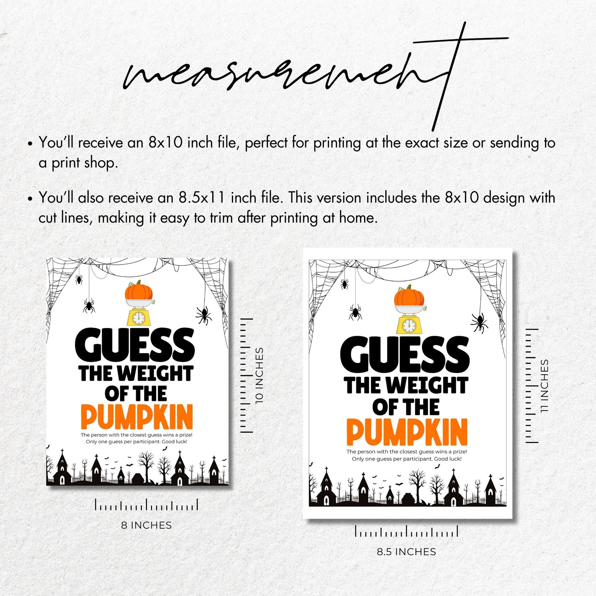 Add a festive touch to your Halloween or fall party with this Pumpkin Weight Guessing Game! This printable game is perfect for both kids and adults, bringing fun competition to your event. Set up a pumpkin, let everyone guess its weight, and see who gets the closest! The winner takes a prize! With bright, spooky designs featuring pumpkins, spiders, and Halloween bunting, this game will be a hit at any fall celebration. Easy to download, print, and play.