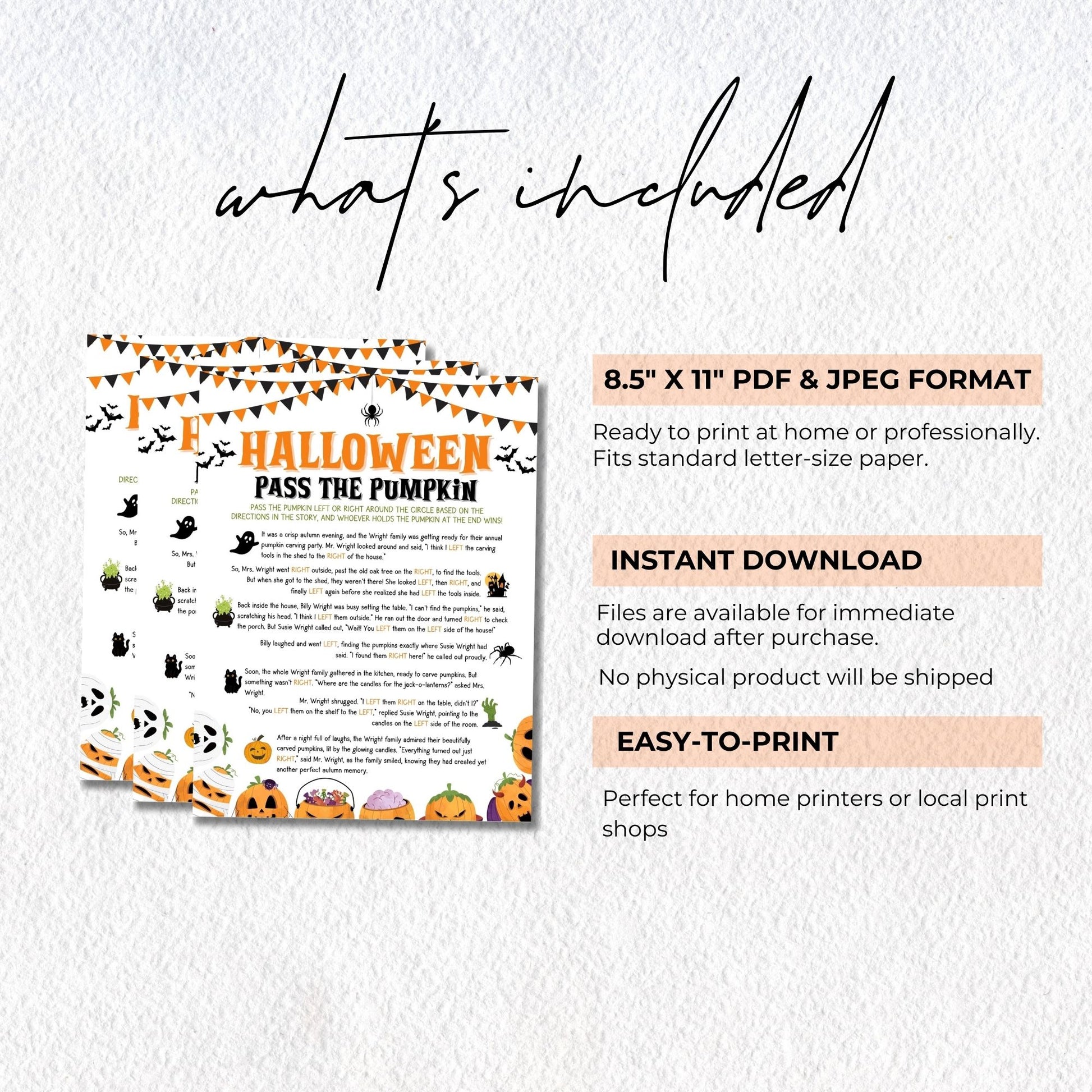 Get ready for a fun-filled Halloween party with this Pass the Pumpkin Game 🎃! Perfect for kids and adults, this group activity will have everyone passing a pumpkin based on the directions in a spooky story. Whoever holds the pumpkin at the end of the story is the winner! 🏆 This printable game is ideal for Halloween parties, school events, or family gatherings, and is sure to bring lots of laughter and fun to your celebration.