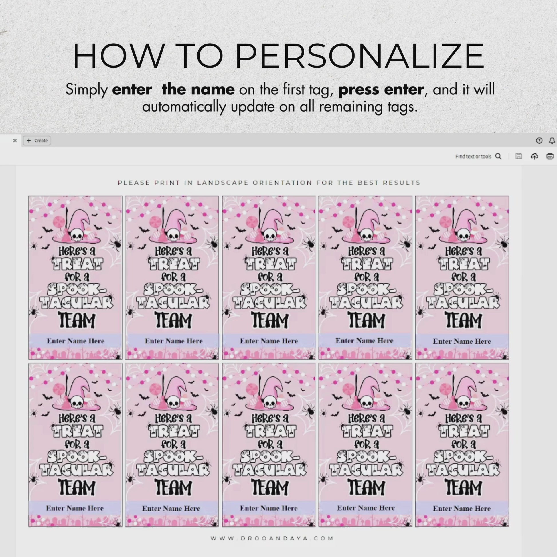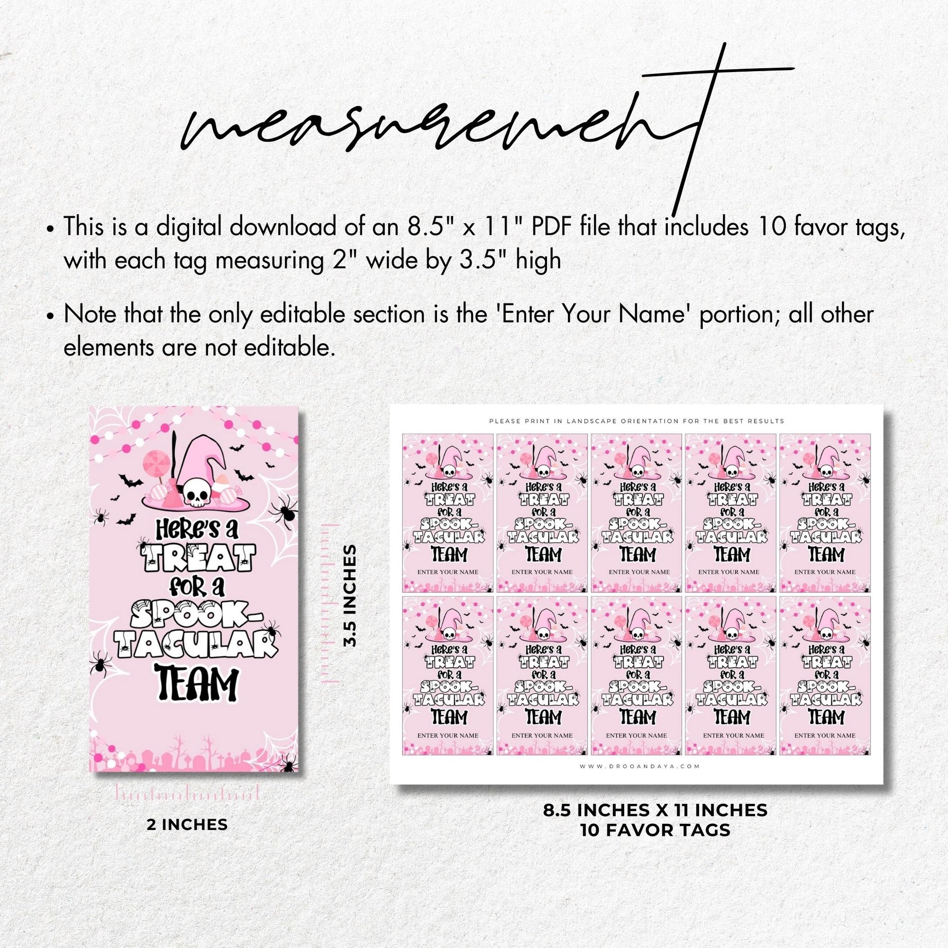 Add a touch of pink to your Halloween treats 🎀! These personalized favor tags are perfect for your spooktacular team. Instantly download and print these cute 2x3.5 inch tags to make your Halloween gifts stand out.