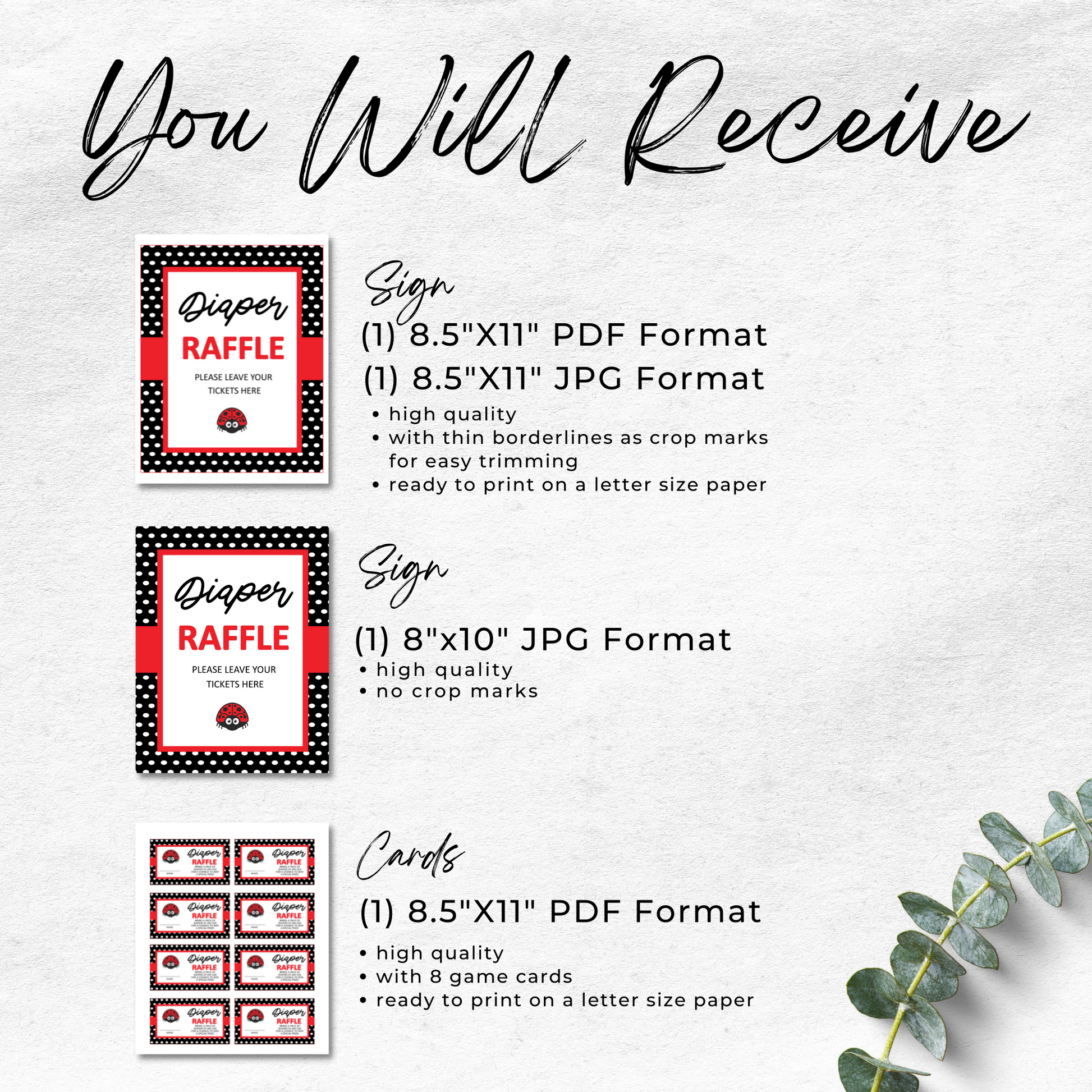 Wondering how to make your baby shower raffle more creative? This ladybug-themed printable set will help you create a fun and easy way to add some excitement to your event. Our printable and easy-to-use raffle sign and ticket will bring excitement and joy to your celebration and help you find the perfect winner.