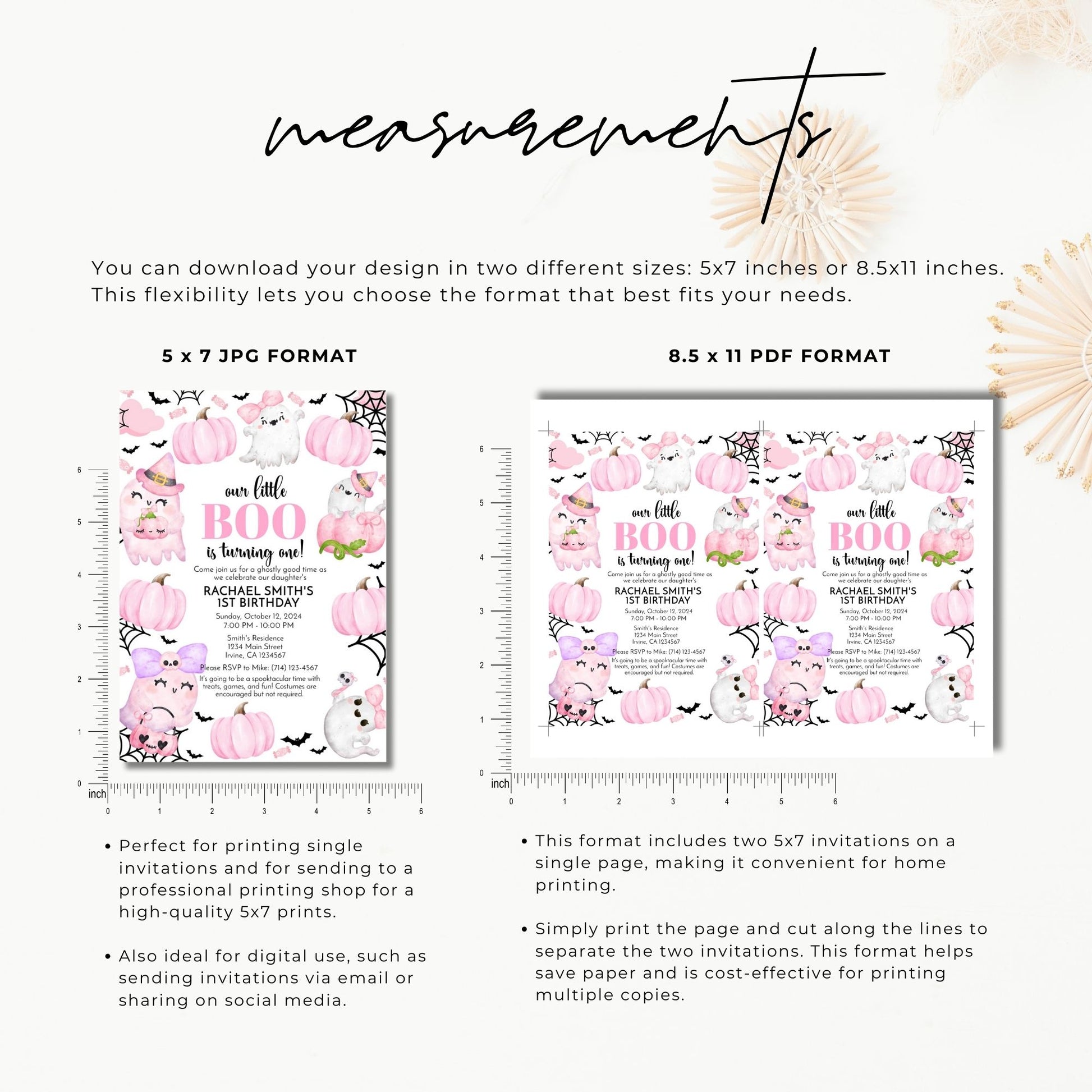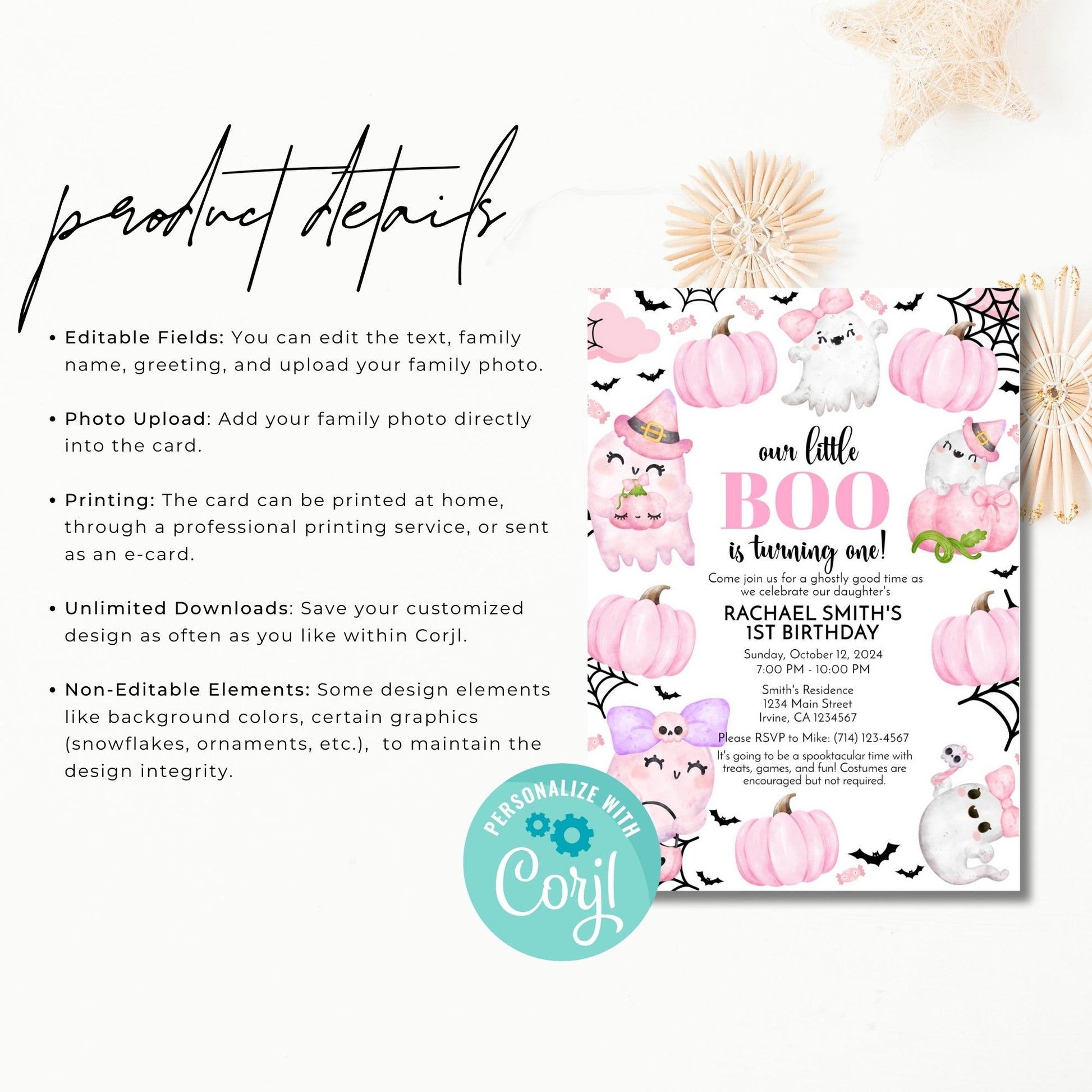 Celebrate your little boo's first birthday with this adorable Halloween-themed invitation! 🎃👻 Featuring cute pink ghosts, pumpkins, and bats, this 5x7 editable template is perfect for customizing all your party details, including the date, time, location, and RSVP information. Easily personalize the design in Corjl, and print at home or your favorite print shop. It's the perfect way to invite friends and family to a spooktacular celebration filled with fun, games, and treats!