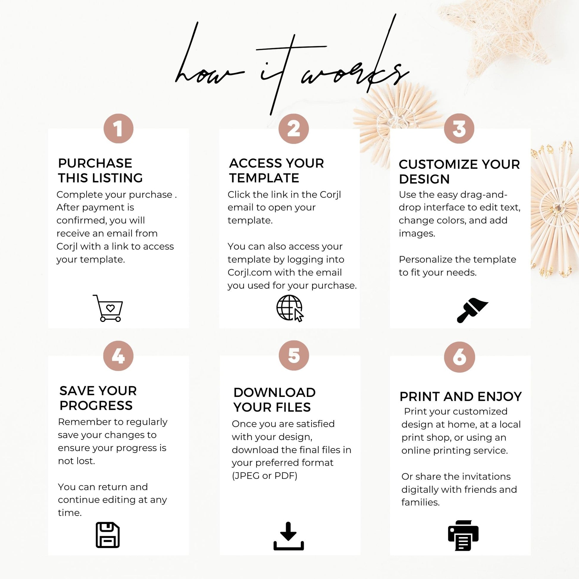 After purchase, you’ll receive two emails: one from Etsy with instructions and one from Corjl with a link to access and edit your template. Simply customize, and you're ready to print!