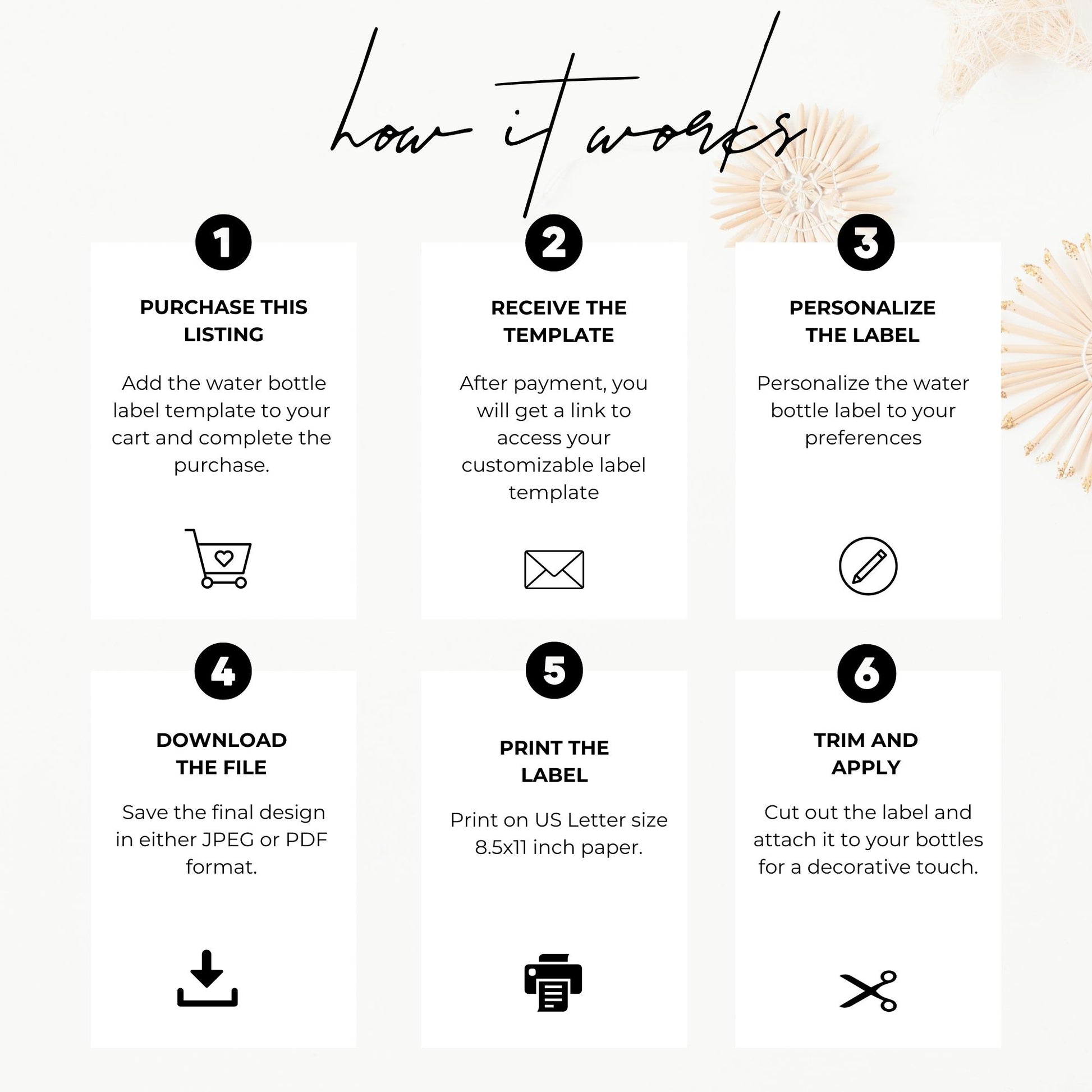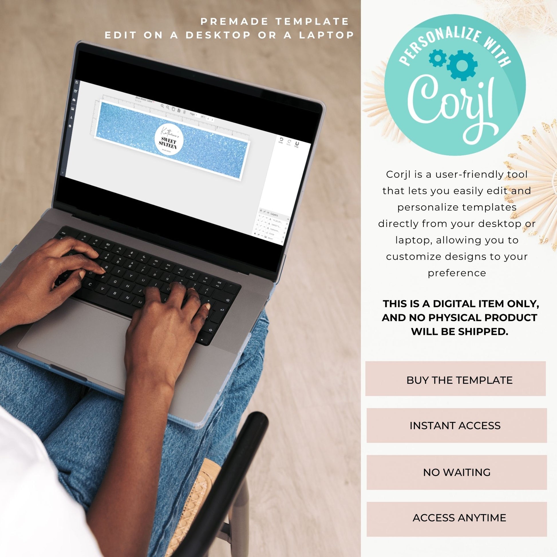 After purchase, you’ll receive two emails: one from Shopify with instructions and one from Corjl with a link to access and edit your template. Simply customize, and you're ready to print!