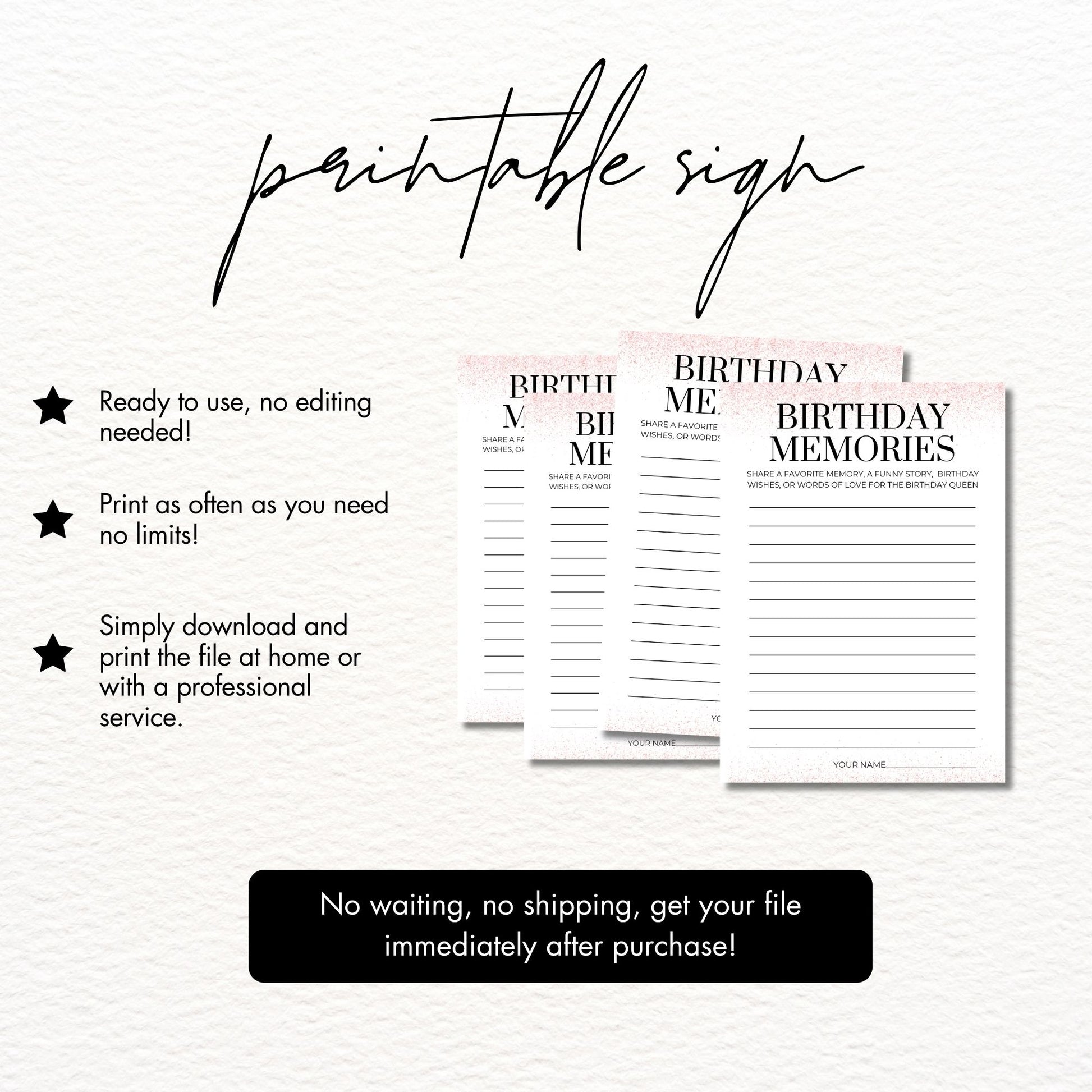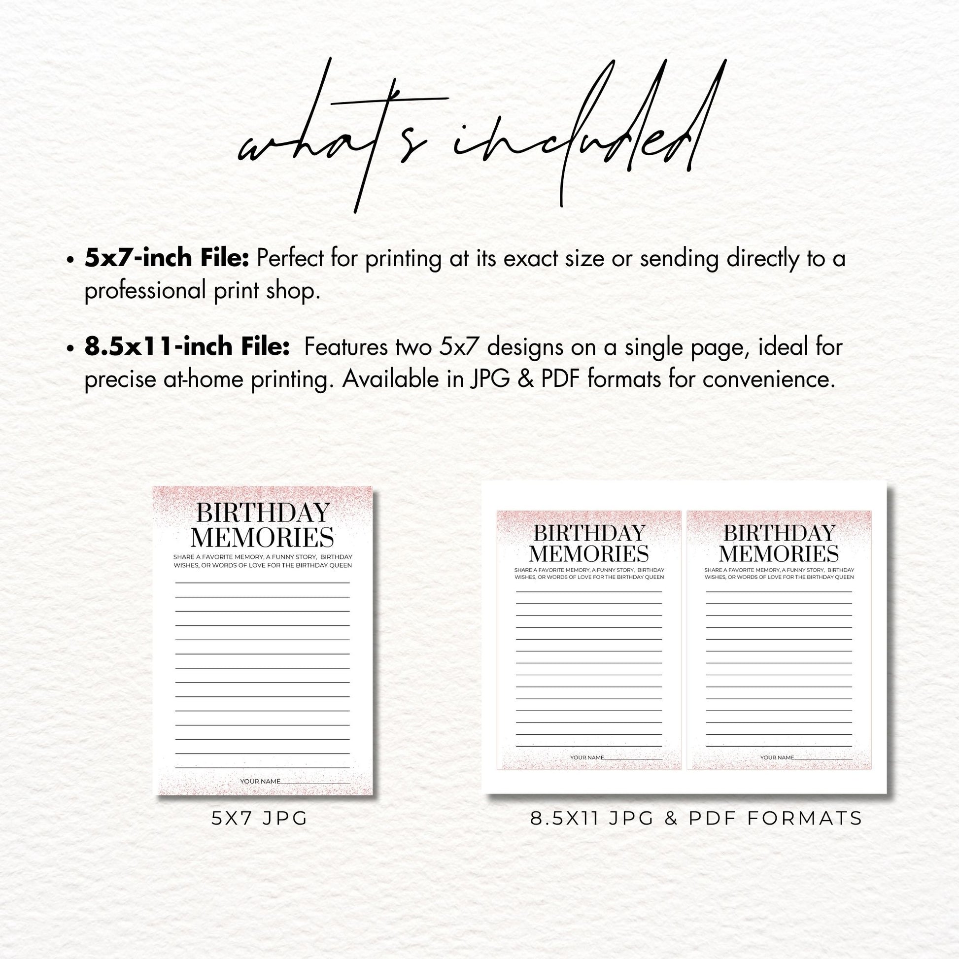 Looking for a meaningful and interactive birthday activity? These Rose Gold Birthday Memories Cards are the perfect way to gather heartfelt messages, favorite stories, or funny memories from your guests in celebration of the Birthday Queen’s milestone!