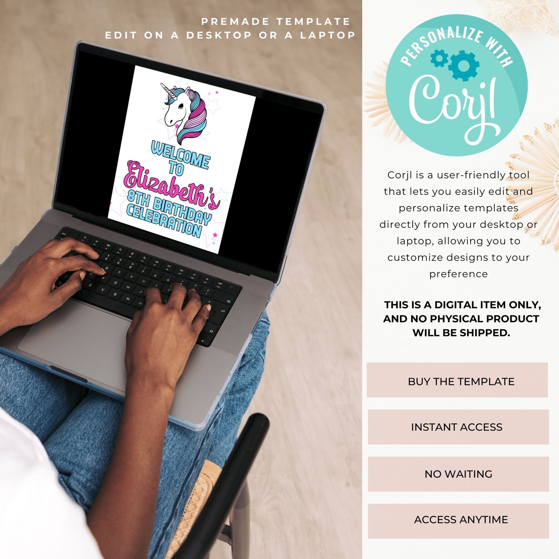 Add a magical touch to your unicorn-themed birthday party with this adorable sign! 🦄✨ Perfect for welcoming guests to your little one’s special day, this 8x10 editable Corjl template allows you to easily customize the name and age. Featuring a cute unicorn illustration with pink and blue star accents, this sign will brighten up any birthday celebration. Just edit, download, and print—creating an unforgettable party experience for your child!