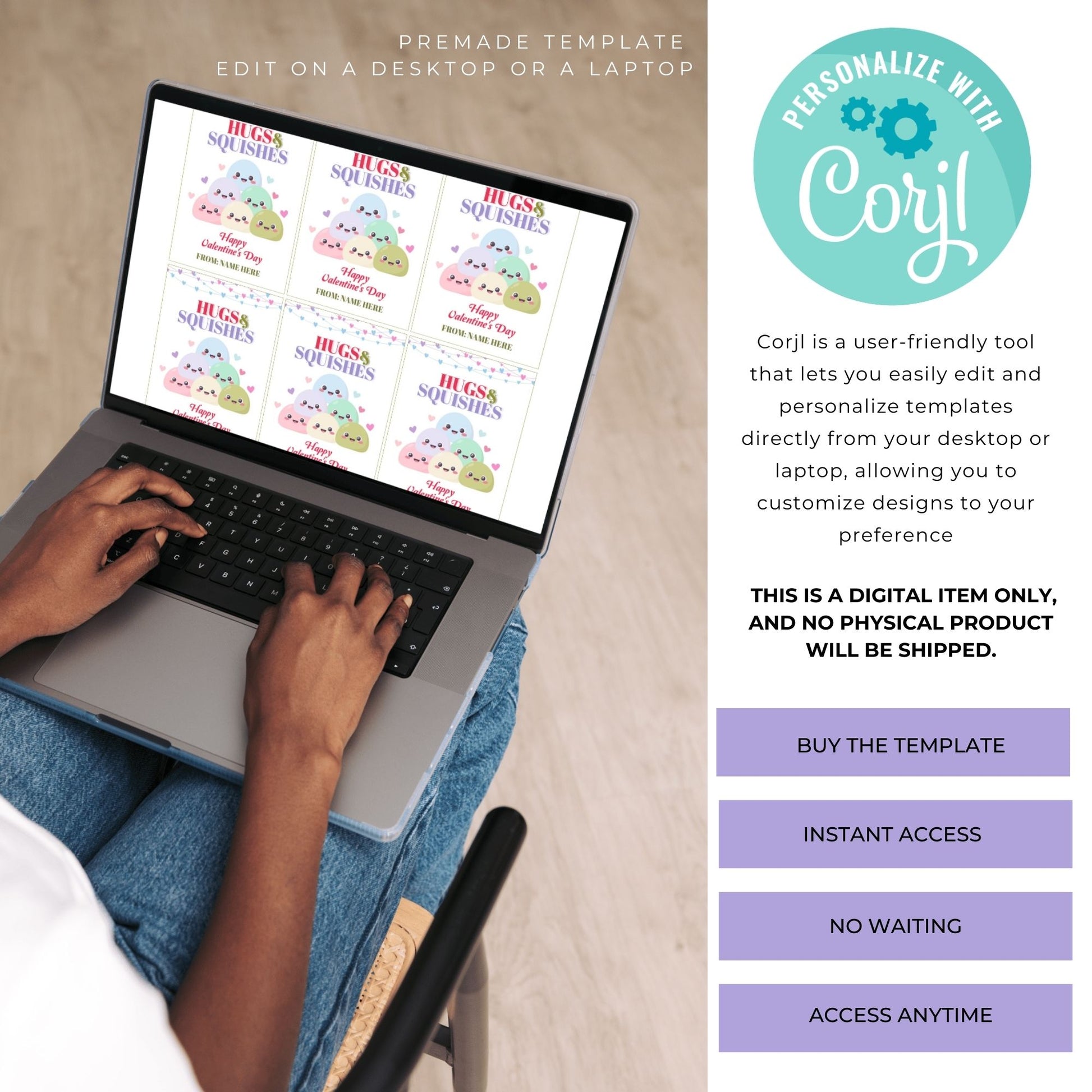 Surprise your loved ones with these adorable Hugs & Squishes Valentine's Day tags! Featuring a cute pastel squishy design, these tags are perfect for classroom gifts, school Valentine exchanges, or party favors. Instantly edit in Corjl, personalize with a name, and print at home!