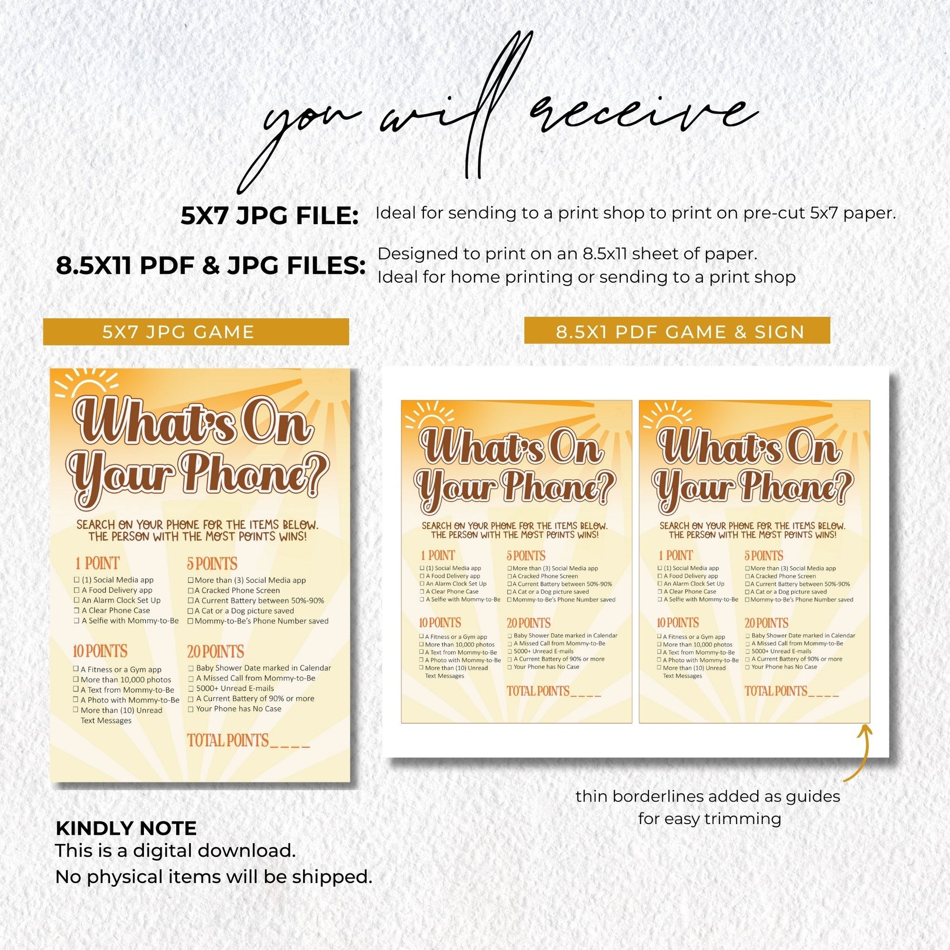 Add some fun to your baby shower with this engaging "What's on Your Phone?" game! This instant download features a vibrant sunburst design that will brighten up any event. Guests will love searching their phones for specific items to score points and compete for the highest total. It's a great way to get everyone involved and create memorable moments!
