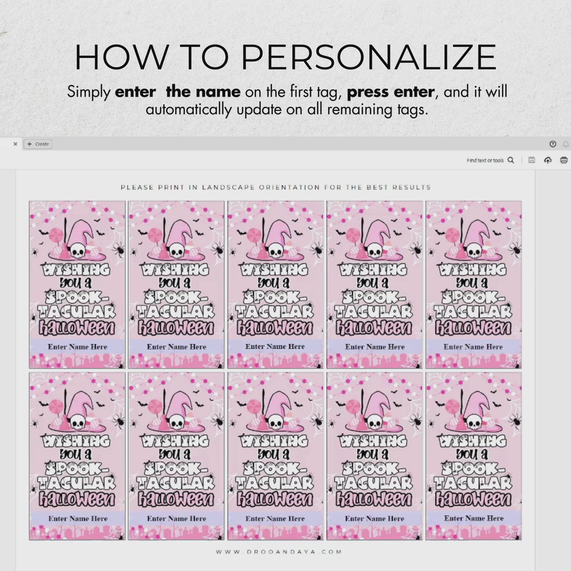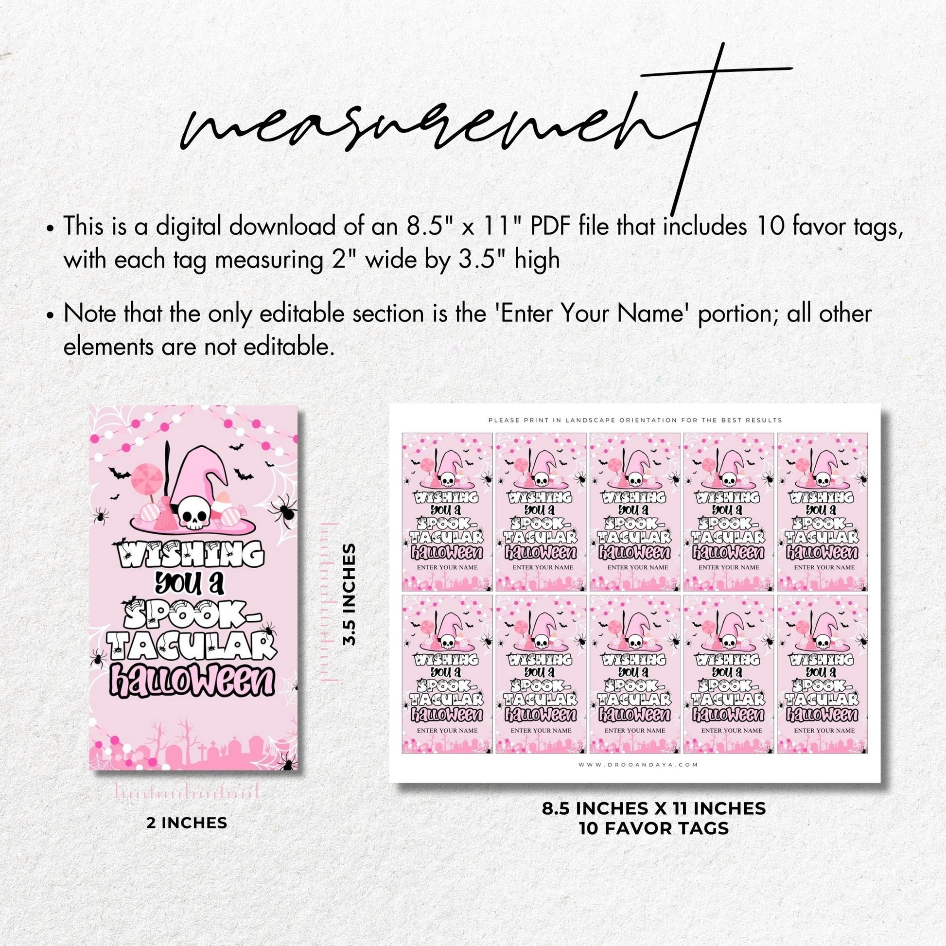 Send spooky Halloween wishes with a dash of pink 🎀! These personalized favor tags are perfect for adding a charming touch to your Halloween gifts. Instantly download and print these 2x3.5 inch tags for a festive and adorable way to celebrate.