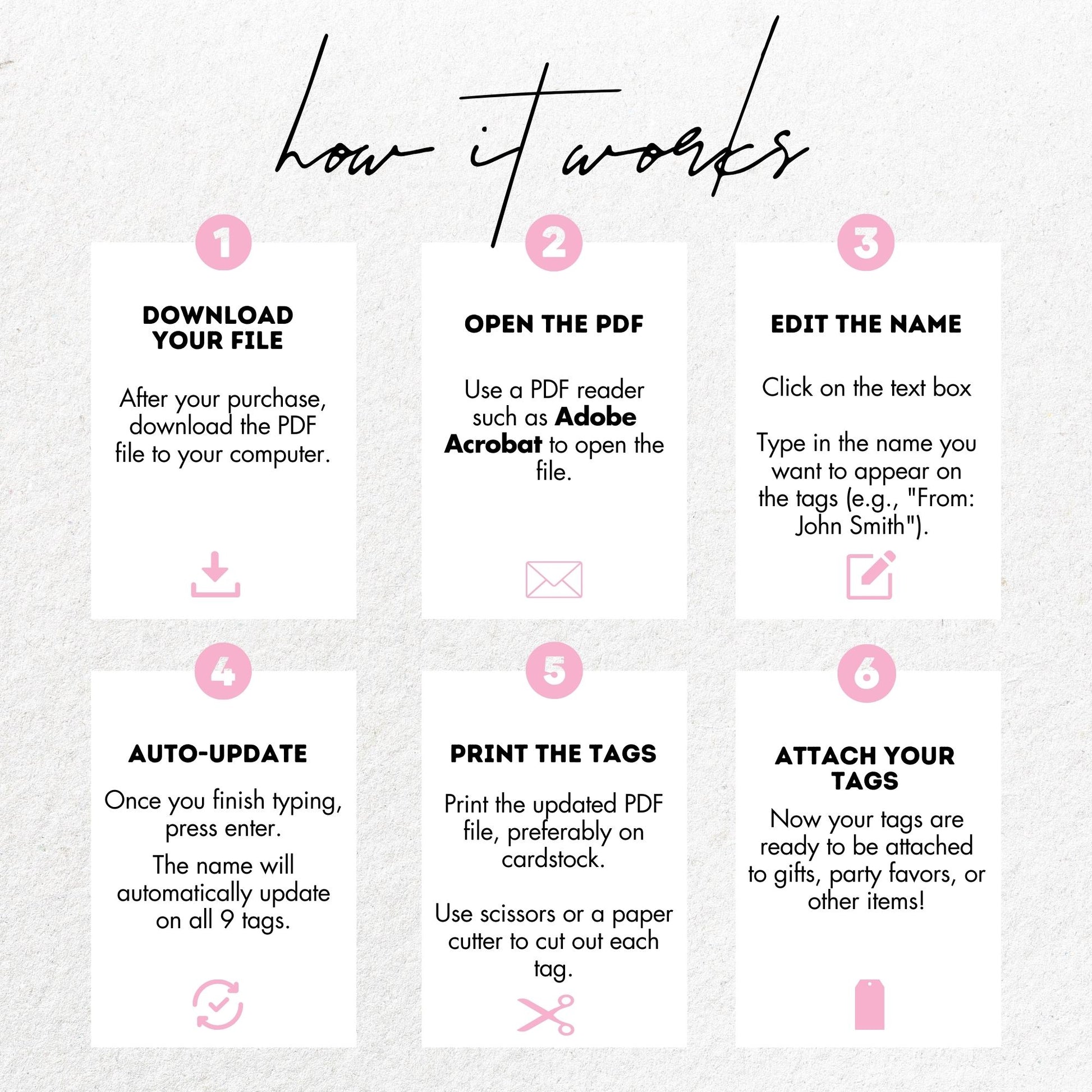 - Once your purchase is complete, you’ll receive an instant download of the PDF file, allowing you to personalize and print your tags immediately.