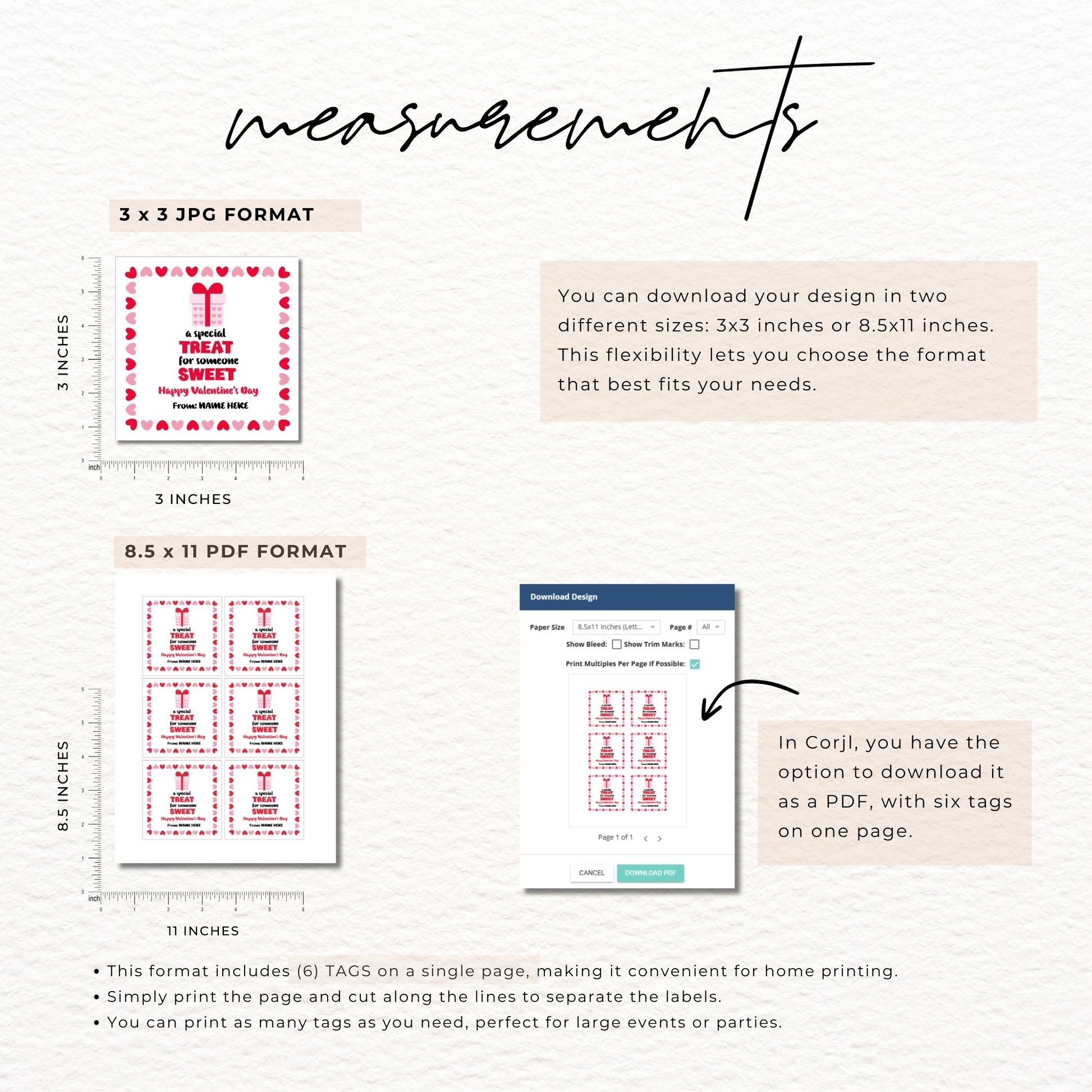 Each page fits three tags on a standard 8.5x11-inch sheet, making it easy and convenient to print at home or with a professional service. This colorful design is sure to bring a smile to your Valentine recipients!